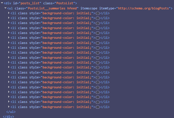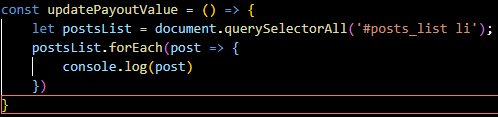 A further problem will present itself when the user scrolls, but for now I will imagine that the user’s scroll wheel is broken. I actually want a list of these unordered list items to iterate through, so I will use the querySelectorAll method of the document, and select all list items which have the posts_list id. Then iterate through, post by post.
