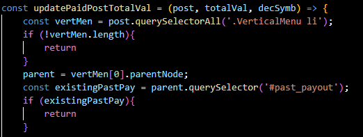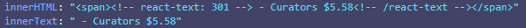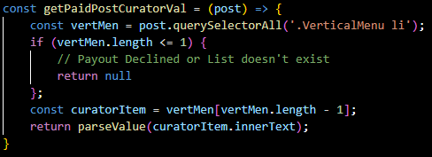 I could iterate through list items and look for innerText that contains " - Curators " in it, but the problem with this is that if someone is viewing the website in a different language, the extension won’t work. So instead, I’m going to have faith that the last item in the list will always be the Curation payout value, and see if it breaks because of that faith. In the case of the post’s payout being declined, the list will be of length 1 (simply displaying payout declined. Otherwise, there are some cases where there is no list items at all (it’s length 0). We will return null in these cases. If we remain in the function, we can begin to work with the curation value by selecting the last element in the list: