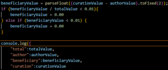 Naturally, the way to get the beneficiary value is to subtract the author value from the curation value, and the result is the beneficiary value, but the author value and curation value are not always exactly the same. They can be off within a couple cents of each other. The way we will account for this is by checking if the resultant value is greater than or equal to 1 percent of the post’s total value. Steemit doesn’t allow authors to give less than 1 percent of a post’s payout to beneficiaries so we know that any beneficiary values worth less than 1 percent of a post’s value are likely to be rounding errors. We will also ignore beneficiary values of less than 1 cent.