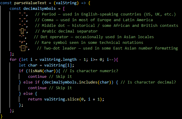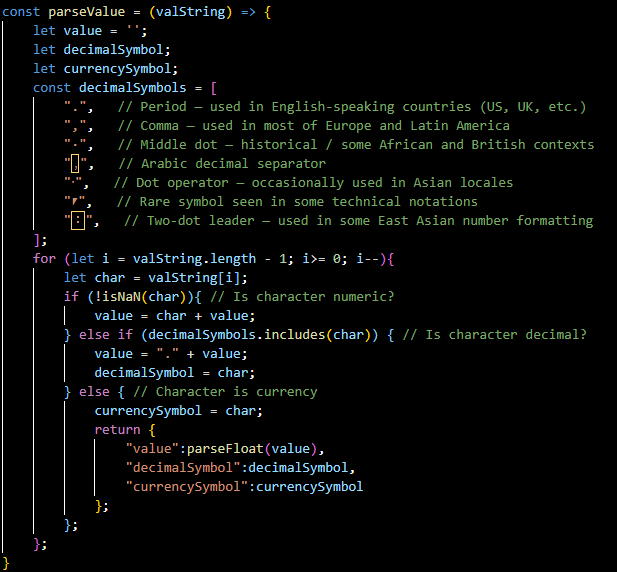 The obvious way to extract the value is to just split the string using the dollar sign, but I realize that many users may not see a dollar sign, but rather see the sign associated with their currency. So instead, I will find the value by making a function that goes through the string characters in reverse order until it hits a currency symbol (a value that isn’t numeric or a decimal symbol):