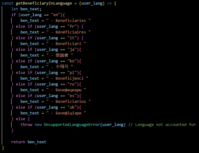 Lastly, I want to make it so the word beneficiaries is displayed in the language of the user. The first thing I have to do is detect the user’s language. Since this information could be useful for a whole variety of things, I will create a new file called language.js, and include a function for detecting the user’s language: