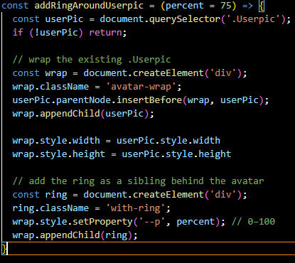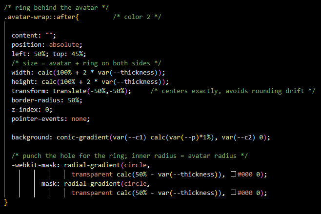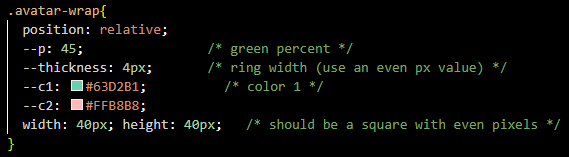 To represent the percentage, we will make a new wrap to go behind the profile picture visually. We will then alter the percentage of green and red in the circle depending on the voting power (which we will set in the function). This makes use of the conic-gradient function in css: