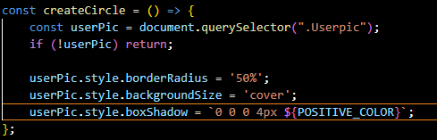The user pic has a class of userPic. We can use this to select it, and then style it with boxShadow to make a circle: