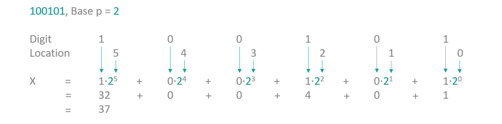 If you managed to stay awake up until this point: Now comes the important part! The described way of de-/encoding number using the 10-adic system can be applied to any natural base greater than 1 (2, 3, 4, ...). The Sumerians had a system to the base of 60! They had to count 60 different symbols before they moved to the next digit. This is the reason why we still divide our hours and minutes into 60 subunits and our circles have 6 · 60 = 360 degrees. In this sense '8:10:03' means 8 · 60² + 10 · 60¹ + 3 · 60⁰ = 29,403 seconds after midnight. Let's see how people react to this kind of formatting when they ask you for the current time. A less drastic application, finally, is the highly anticipated binary or 2-adic system. All you need is two symbols (let's call them '0' and '1') and plenty of powers of the base 2. For an example, we will look at the number '100101' in the binary system. It represents the value