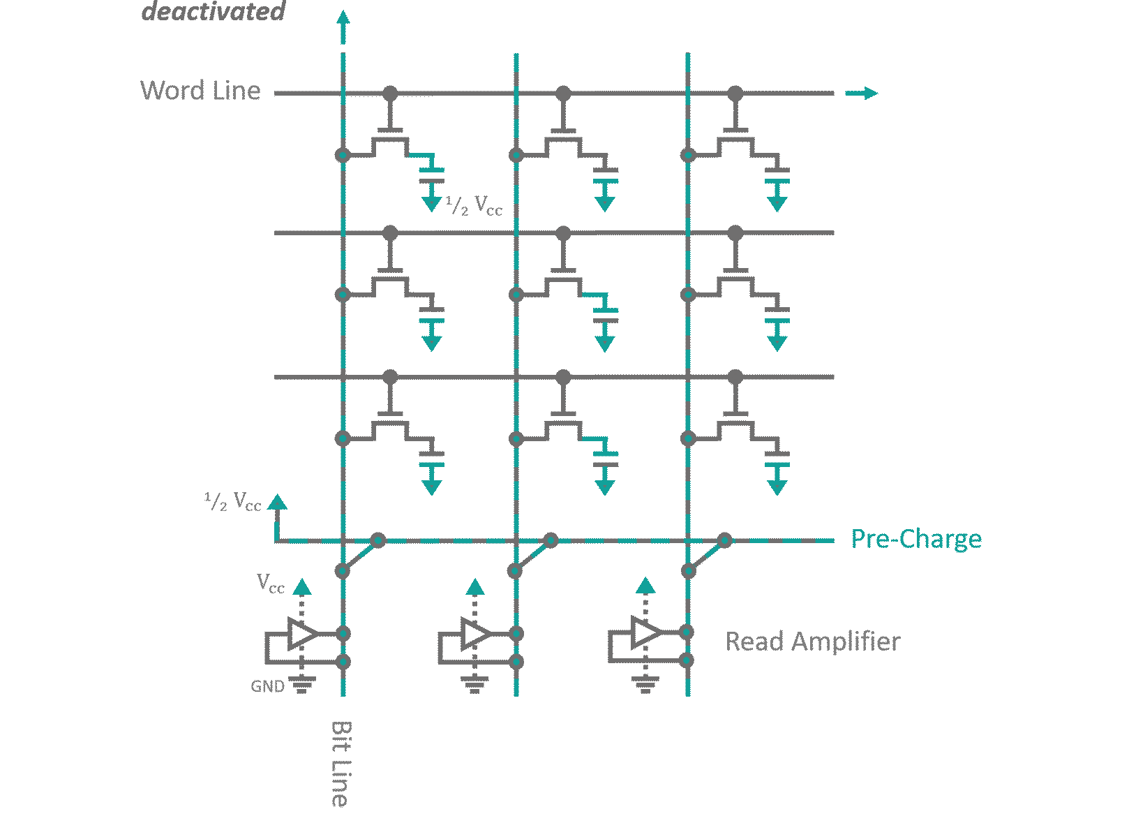 Without going into too much detail, DRAM memory is made from a grid like structure of transistors as can be seen in figure 7. Every transistor feeds into a capacitor for single Bit storage. Each row of cells has its transistor gates connected to a common selector line (Word line). Columns of cells have their source connection joined into individual Bit lines. While a memory region is deactivated, its Bit lines are charged with a voltage that resembles half of the 'High' signal voltage. When you want to read a specific row of Bits, first you need to disconnect the charging voltage, than you active the the corresponding Word line. As the transistors become conductive, a charge exchange between the Bit line and the storage capacitors occurs until both carry an averaged charge. Depending on whether the capacitor was initially charged, i.e. the Bit was set or not, this average will ris above or fall below the Bit line's pre-charge. A read amplifier connected to the Bit lines is activated, which discriminates the small charge differences into logic states and sets the Bit lines to 'High' or 'Low' potential accordingly. This recharges the storage capacitors to full potential and allows pushing the read out bits onto the outgoing data BUS. Writing is as simple as pushing the input data into the read amplifiers, effectively overwriting their current states. The new states will either charge or discharge the connected storage capacitors accordingly. All thats left to do in either case, is to deactivate the transistors by removing the signal of the Word line, disabling the read amplifiers and reconnecting the Bit lines to the pre-charge voltage. This happens within a couple nanoseconds (which is considered rather slow) but can be engineered to reach insane memory densities. Once again, this technology has it's flaws. When multiple very small capacities are crammed into as little space as possible it is almost impossible to properly shield them against each other. By accessing a memory region in very high frequencies you are forcing the RAM to charge and discharge the storage capacitors of the desired data row. Their electrical dipole moment will couple to all surrounding capacities. A recently discovered vulnerability known as Rowhammer exploits this by quickly alternating access between two memory regions sandwiching a deactivated third one. It has been proven [2] that the coupling between capacitors is strong enough to enforce the flipping of bits in the deactivated memory region. As you can imagine, this opens up for countless attack scenarios on critical memory regions. One more note on volatile memory in general: In my processor simulation I used NOR gate RS-latches for the registers (Gate based RAM is referred too as static random access memory SRAM). No one in their right minds would do that in real life applications, nowadays. If toggling single transistors, specifically engineered for memory purposes, are considered 'slow', you can calculate for yourselves how long it takes a Bit to traverse a d-latch consisting of something closer to 10 transistors. This design decision was forced upon me by Logisim, which does not allow for the simulation of dynamic (using capacitors instead of gates) memory cells. It does not matter too much though, since Logisim actually does not include run times what so ever in the simulation steps... everything happens simultaneously anyways. Just keep that in mind when you are actually trying to pirate my design to etch and mass produce these advanced '4‑Bit, 8 instruction' Behemoths of digital engineering.