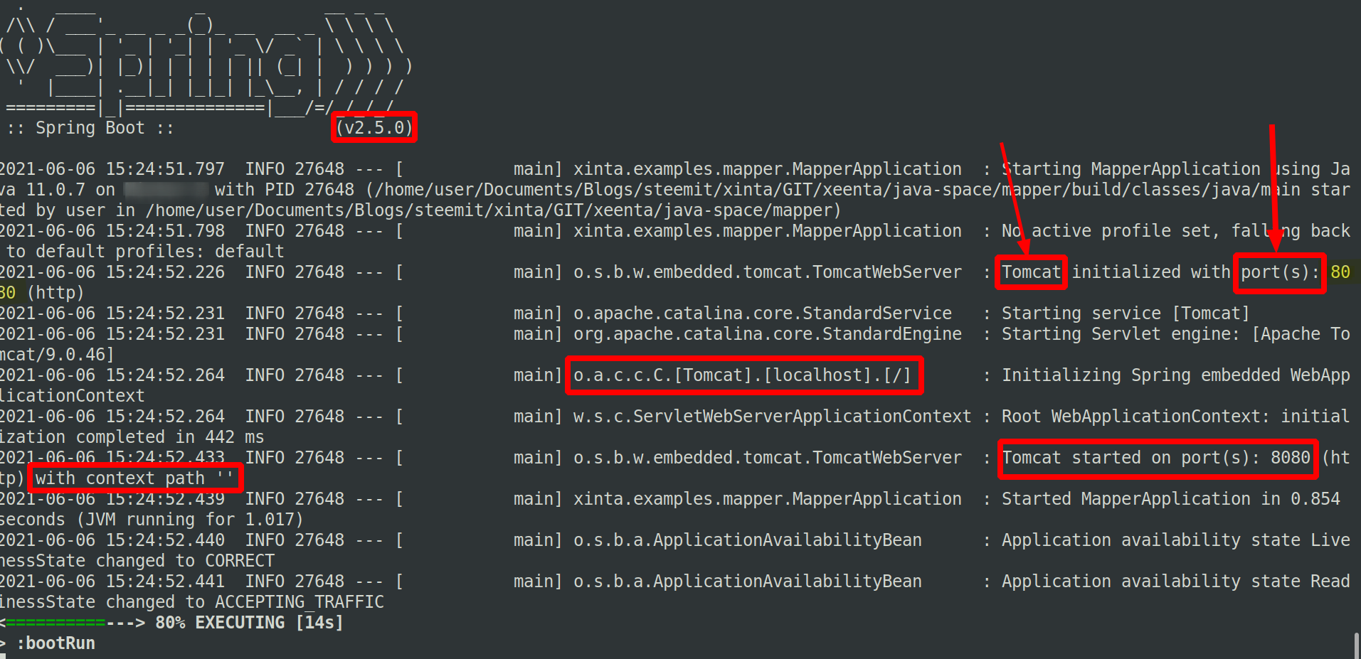 We can configure Spring Boot so that Tomcat listens on other ports, and we can define a context, which is important if we deploy the application in a container where other applications live.