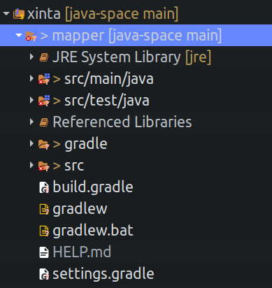 Hit the GENERATE button at the bottom to download mapper.zip. Unzip it wherever you prefer. Now, you need to import this Gradle project in your IDE. I'm using Eclipse and have a Gradle-related plugin installed from the market place, so I do Import… → Gradle → Existing Project…, and so on (this isn't a lesson about how to import Java projects into Eclipse…). At the end I have the project ready, and it appears like this in the Eclipse's model explorer: