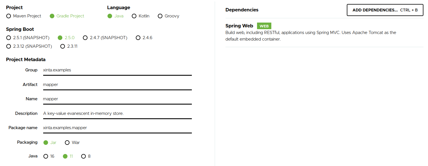 Let's use Gradle, Java as the language (despite its defective design), Spring Boot version 2.5.0, packaging jar and Java 11 (you just installed JDK 16, so that you could select Java 16 too… anyway, we don't need recent language features).