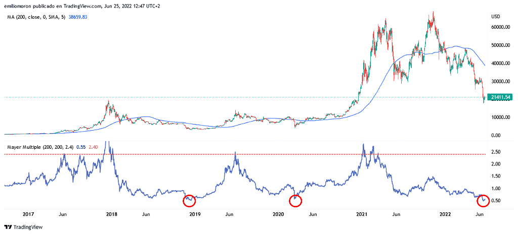 At the moment the Mayer Multiplo has a value of 0.52, a fairly low value that corresponds with the current market sentiment, and as we can see in the following chart, values as low as the current one have only been recorded in March 2020 and December 2018, and as we can notice, these previous lows marked the beginning of a bullish cycle.