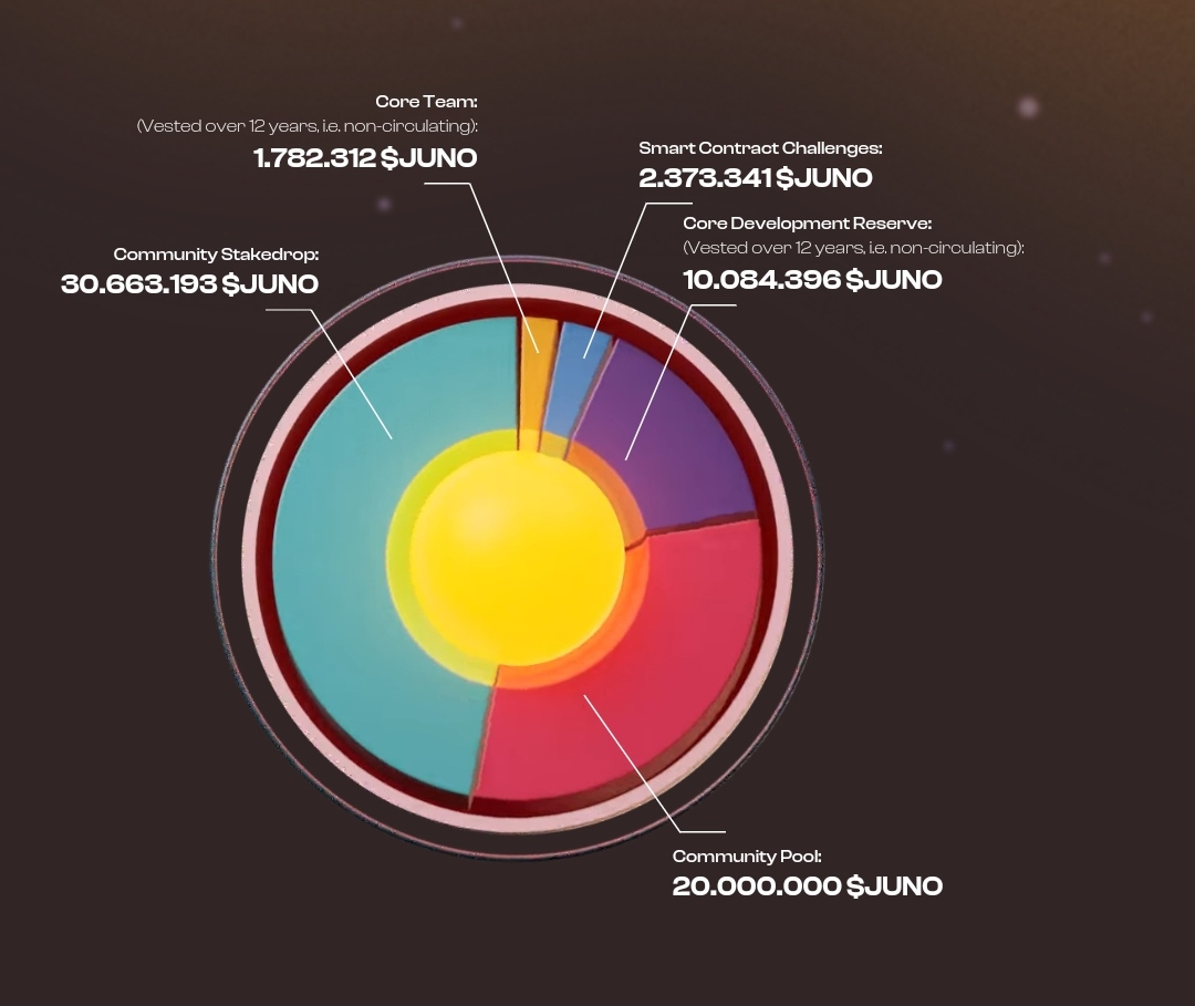 - Core Development Reserve (Vested over 12 years, i.e. non-circulating): 10.084.396 $JUNO