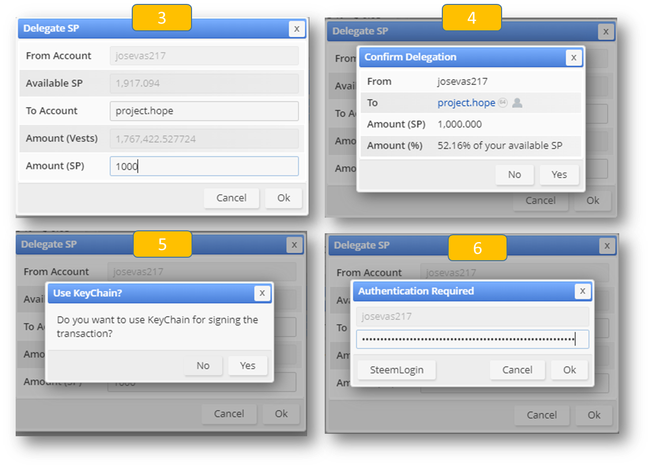 3 Here you must enter the amount of Steem Power you are going to delegate, and the account you are going to delegate to. Click OK.