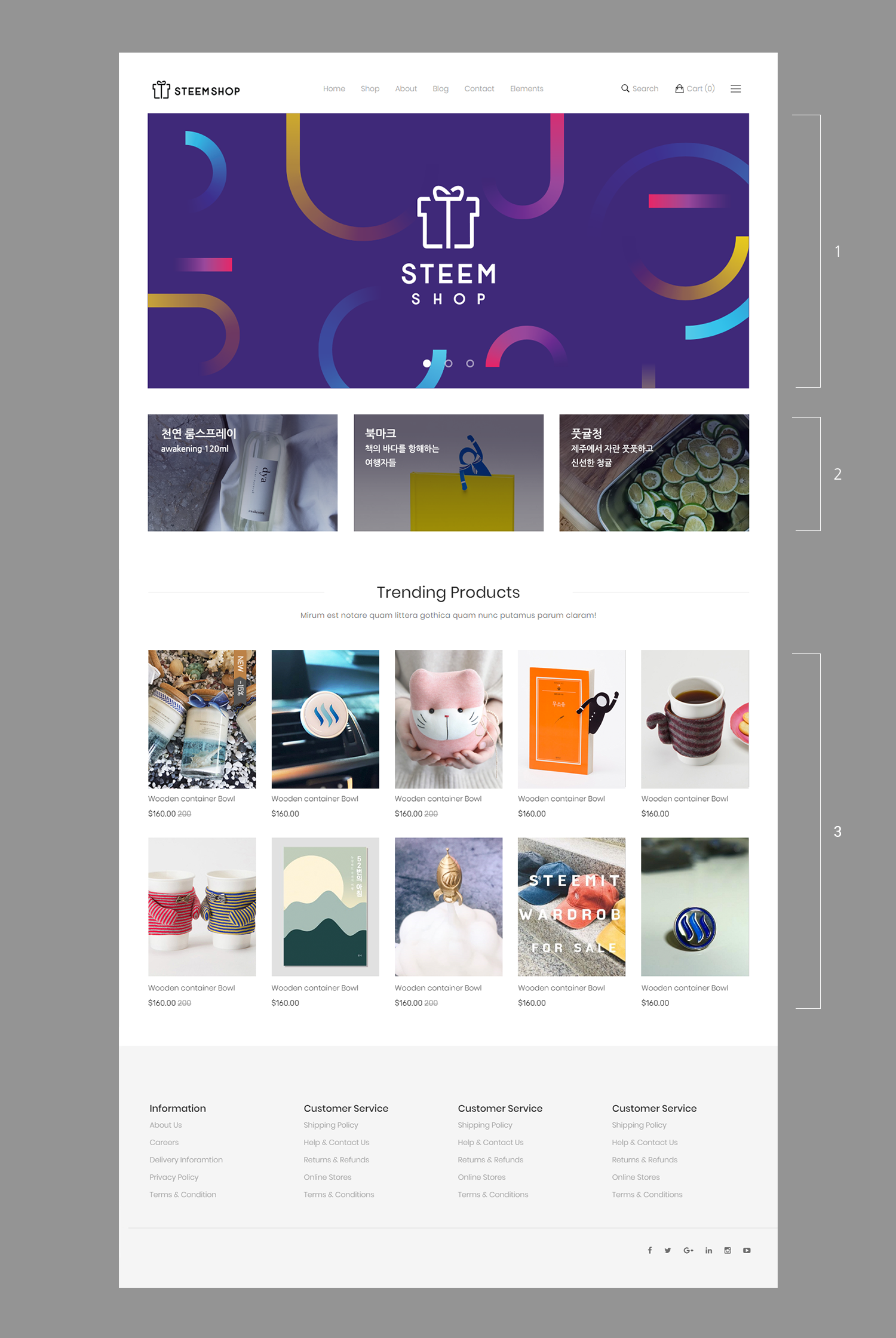 메인페이지 입니다. 1번 영역은 이벤트 배너가 될 것 같고, 2,3번 영역은 아직 정의하지는 않았지만 판매율 같은 기준에 의해 디스플레이 하는 영역이 될 것 같습니다. 예시 이미지에 쓰인 이미지는 스팀샵 입점된 상품들입니다.