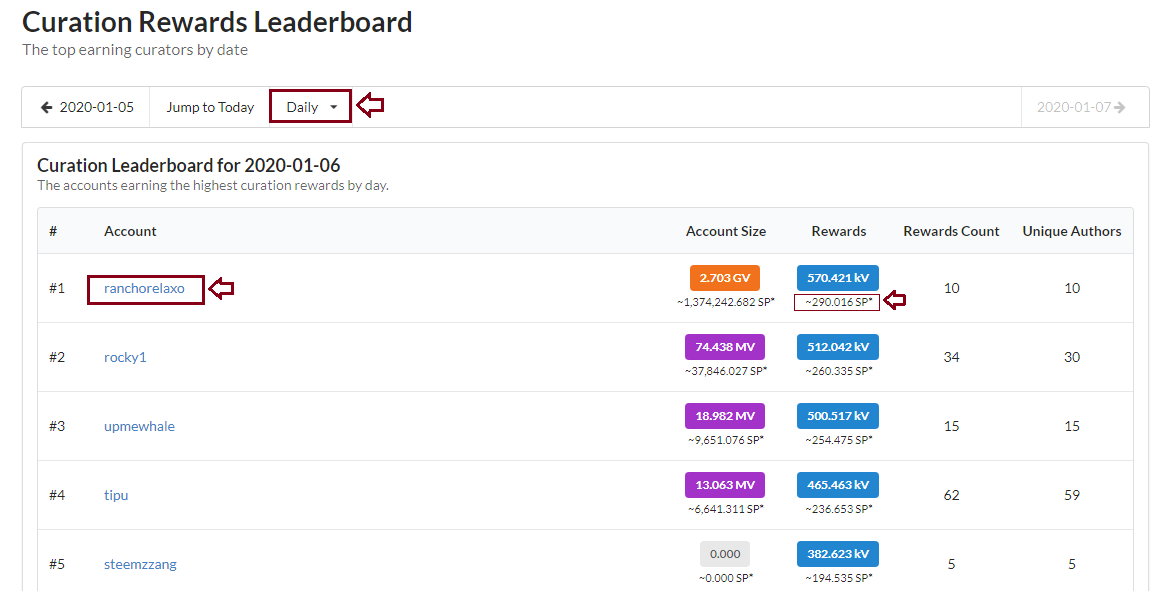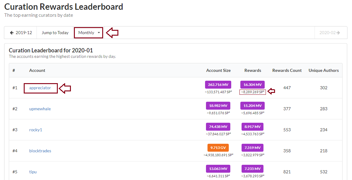 Now you are in the Curation Rewards Leaderboard page, here you can check the daily, monthly data of curation rewards and hence you will get to know the rank of the various curators in terms of earning curation rewards.