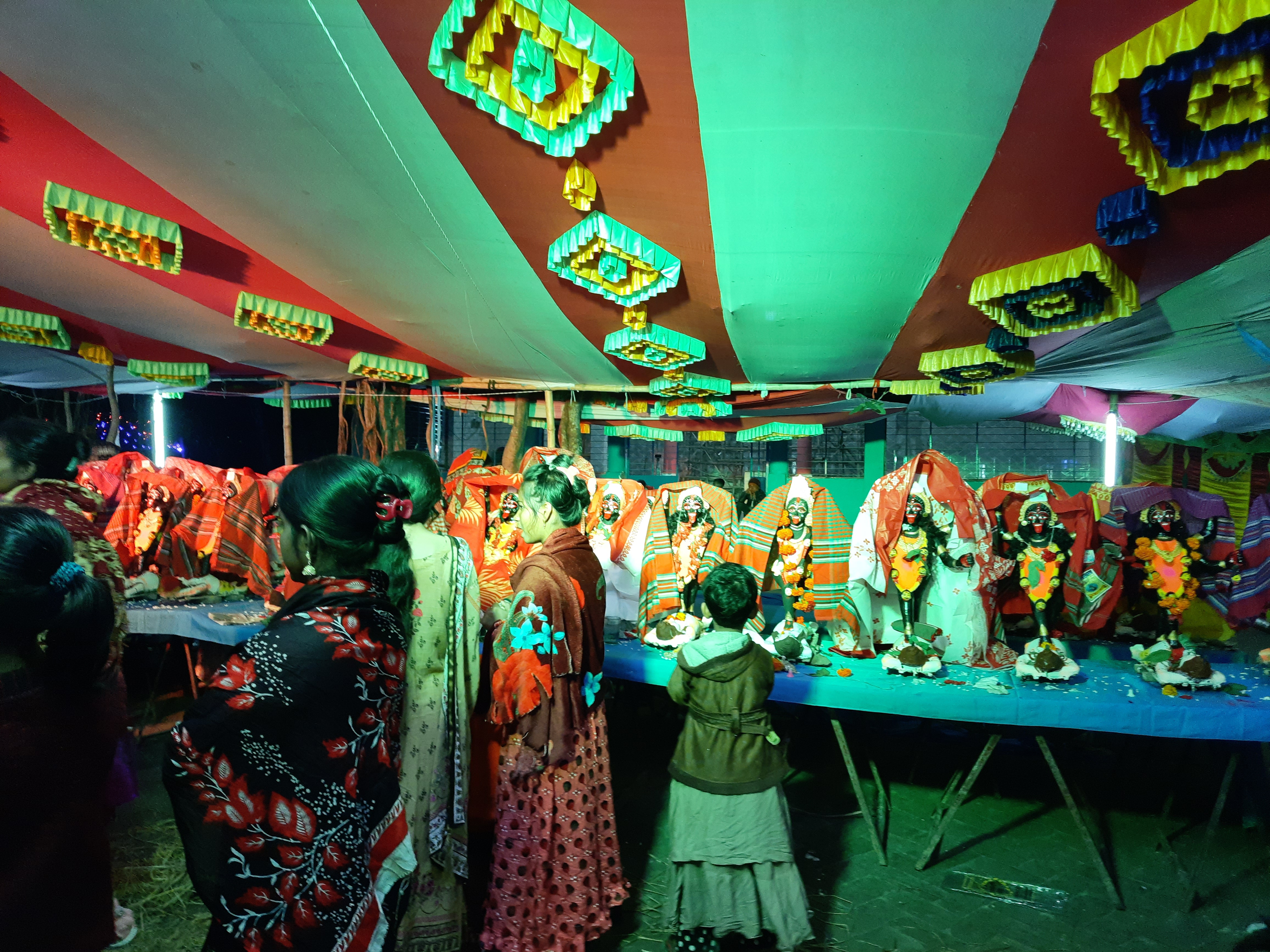 সারারাত ধরে জেগে থেকে এই পুজো করার পরে ভোররাত্রের দিকে ফুল পড়ে । ফুল পড়ার ব্যাপারটা এই গ্রামের সব লোকের বিশ্বাস। আমি যেহেতু প্রথমবার এই গ্রামের পুজো দেখছিলাম তাই সবকিছুই আমার জন্য নতুন ছিল । আমি রাতের দিকে এই অনুষ্ঠান দেখার জন্য যাই। বেশ ঠান্ডা লাগছিল তখন। যাই হোক আমি সেখানে গিয়ে একটি চেয়ারে বসে এই পুজো অনুষ্ঠান দেখি। এই পুজো অনুষ্ঠানের জন্য শত শত কালী প্রতিমা আনা হয়েছিল। পুজো মন্ডপের সামনে একটি বড় বটগাছ ছিল। এই বটগাছের নিচেই এই পুজো সম্পন্ন হয়। এই পুজোতে সব থেকে বেশি মহিলারা উপোস থাকে এবং পুজো অনুষ্ঠানে অংশগ্রহণ করে। তবে কিছু কিছু পুরুষ এবং ছেলেপেলেরাও ছিল যারা এই উপোস রেখেছিল।