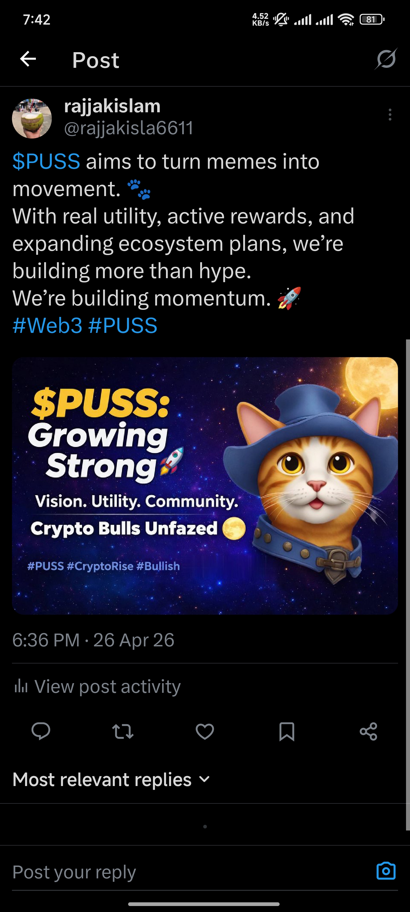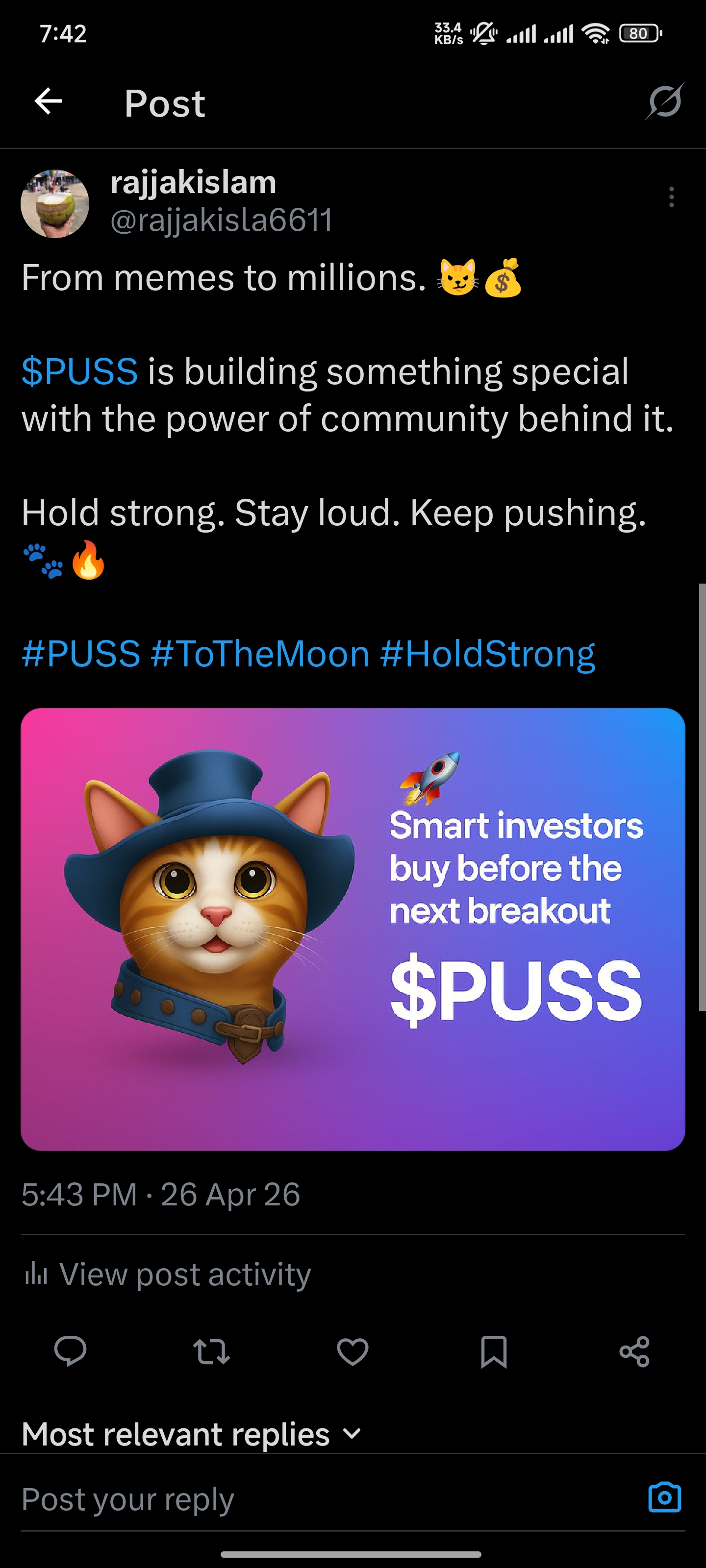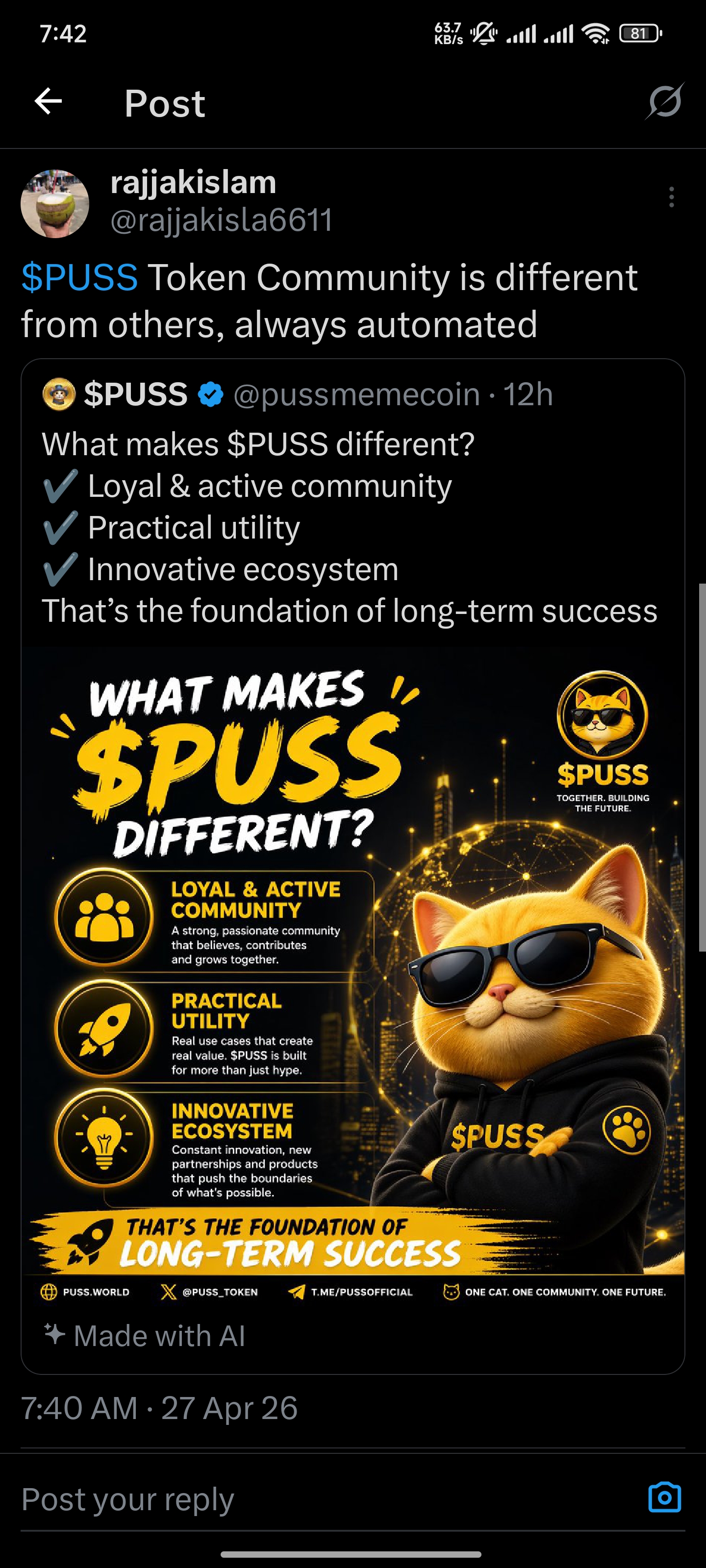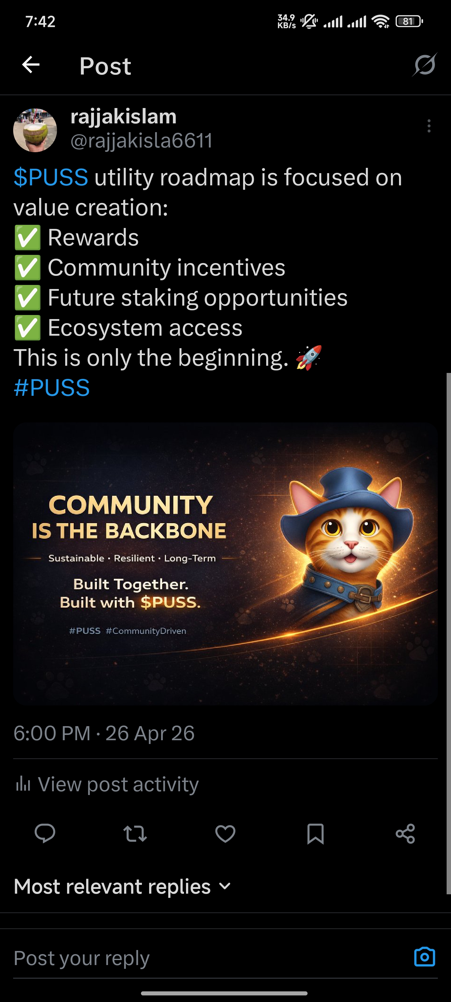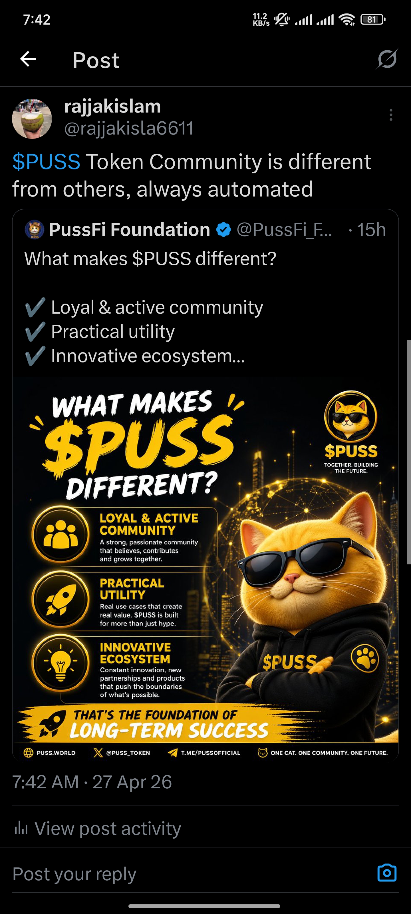 @kibreay001 today I am going to share with you a post about $PUSS token promotional issues. Since I am a member of the promotion team, I try from my place to share with you the links of all the work that we constantly do for $PUSS token promotion among our team members through my post at the end of the day. I think that all the users we are involved in for promotional work, we are constantly trying from our place how to complete the $PUSS token promotion work beautifully. And our admin moderator is constantly giving us guidelines, we are constantly trying to work according to those guidelines. At the end of the day, we are trying to submit the history of each day's work next to our names and after seeing those lists, we are paid at the end of every month, in this way we have been fulfilling our promotional work responsibilities. I think that if all the users in the community participate in the promotional work with us, I think it is possible to come forward in a very short time, so I would like to request everyone to maintain the continuity of the promotional work and try to move forward. This is how it is possible to move forward by doing the promotion work of the $PUSS token.