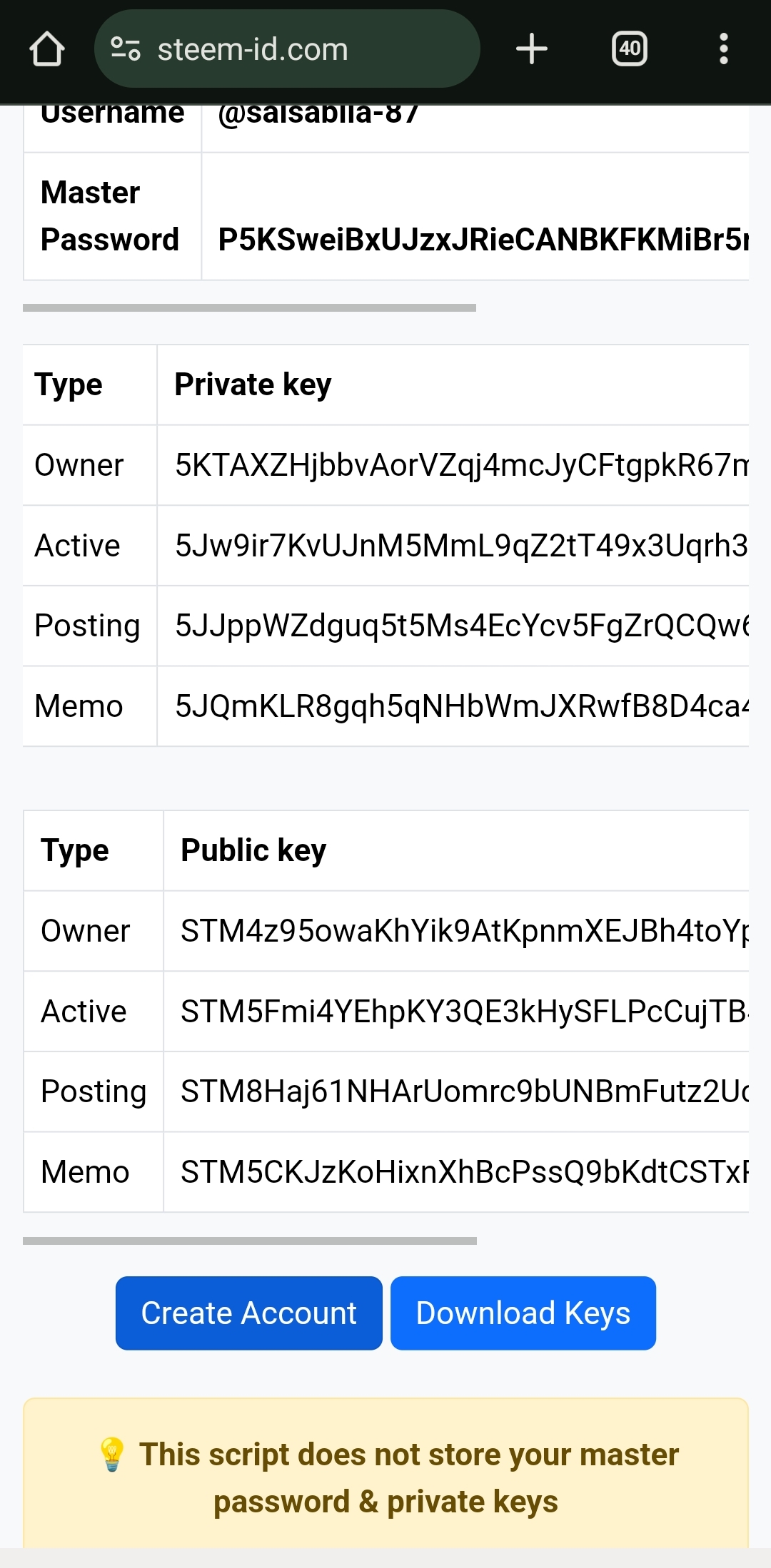 Then scroll down and click on 'Create Account' and also 'Download keys'.