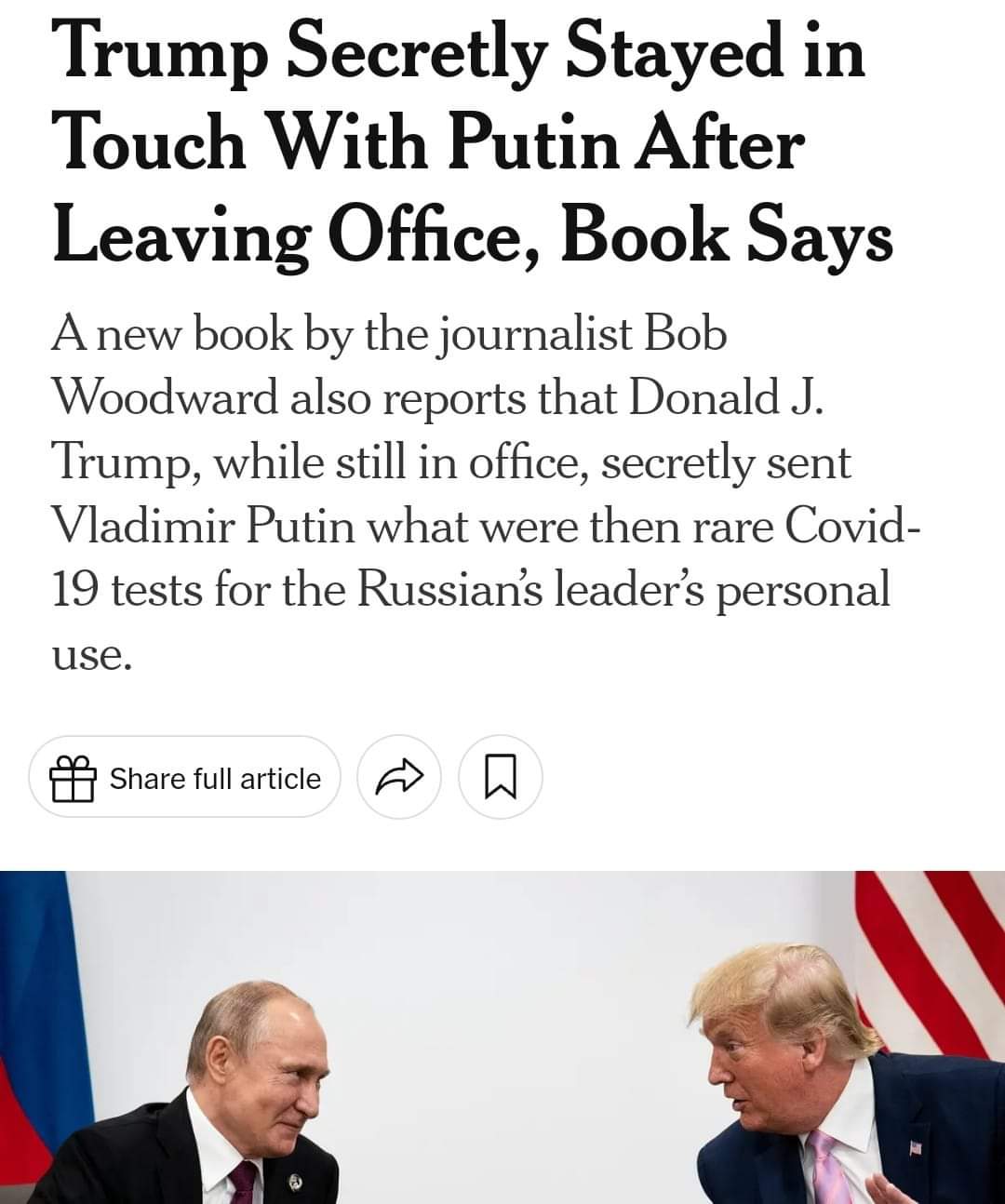 Journalist Bob Woodward reports that Trump has secretly spoken seven times with Putin since leaving office and during the height of the pandemic sent Putin coronavirus tests for his personal use amidst the test shortage.