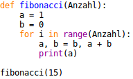 Ich kann die Anzahl variieren und erhalte immer die korrekte Fibonacci-Folge mit der gewünschten Anzahl Zahlen.