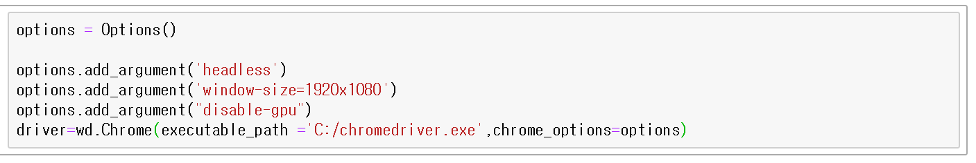 Headless 옵션으로 크롬창 안띄우고 진행할 것이고, 일부 사이트는 창 사이즈 크기에 따라 웹사이트 구조가 달라지기 때문에 우선 1920*1080으로 최대화 설정했습니다.