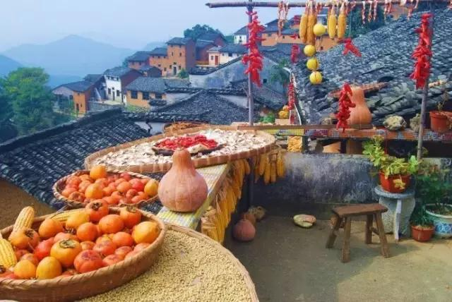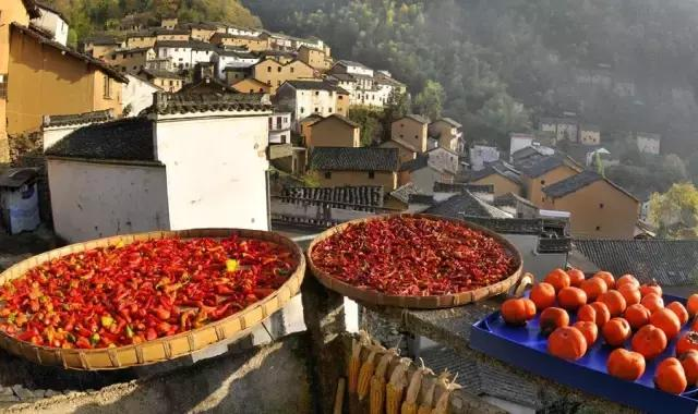 晒秋是阳产的一大景观,家家户户的平房顶上,房屋前,庄稼、瓜果、蔬菜在太阳下熠熠发光。