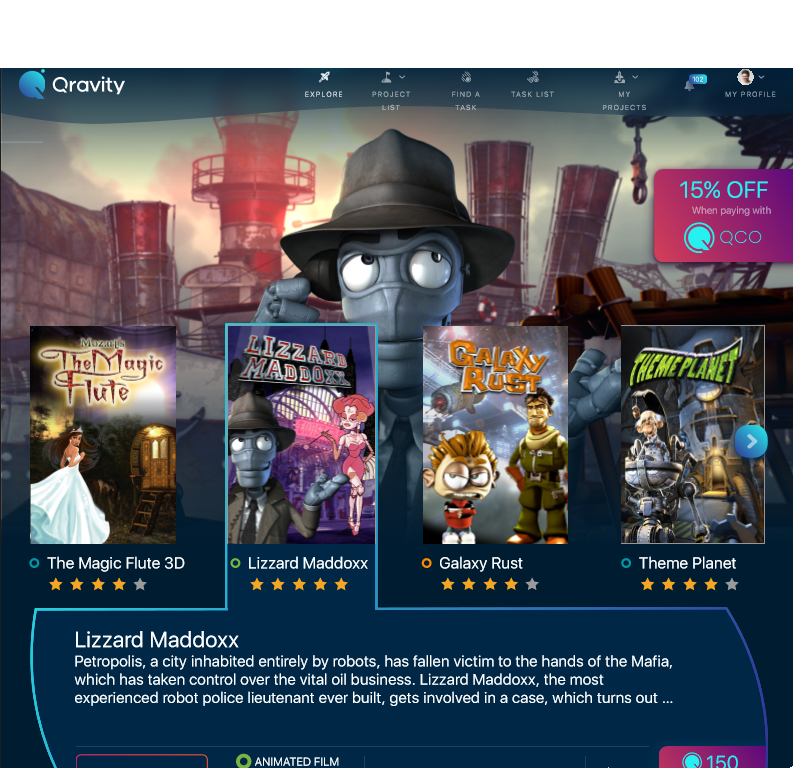 The platform generates revenue through its shares in ownership of each project on a percentage basis, and by licensing content to consumers. For every project, Qravity’s stake is fixed at 10%. To earn this percentage, the platform offers