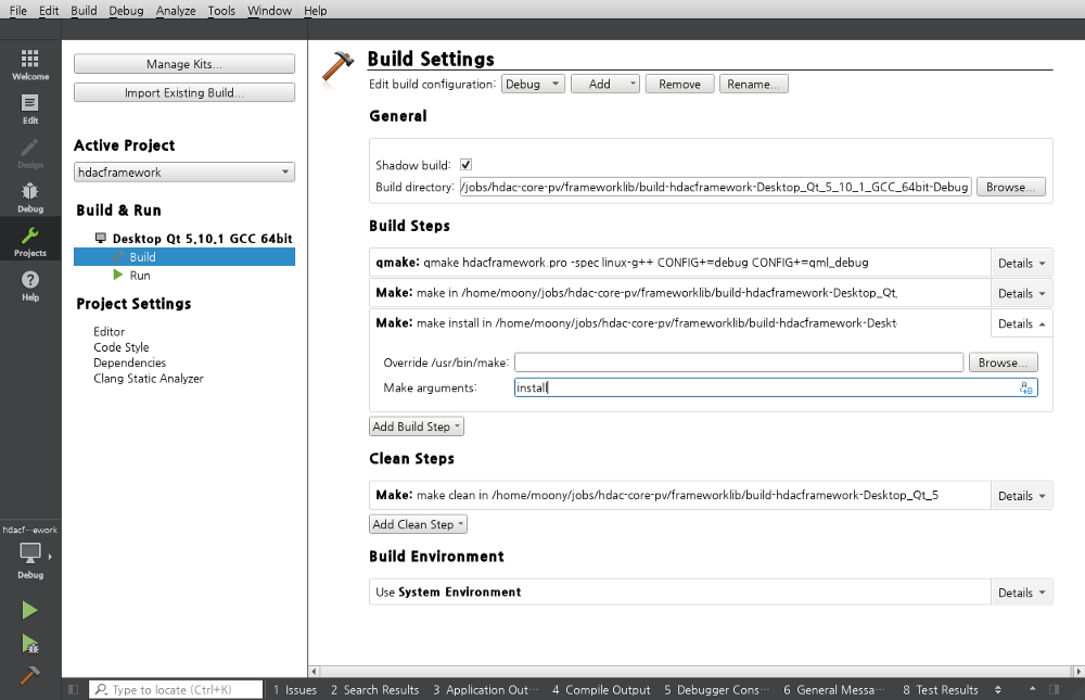결국 해결한 방법은 Qt Creator의 Projects 탭을 선택하여 Build Settings의 내용을 추가로 설정해주는 것이다. 즉, Build Steps 버튼을 클릭하면 드랍박스가 나타나는데, Make 를 선택하고, Make arguments에서 install을 입력한다.