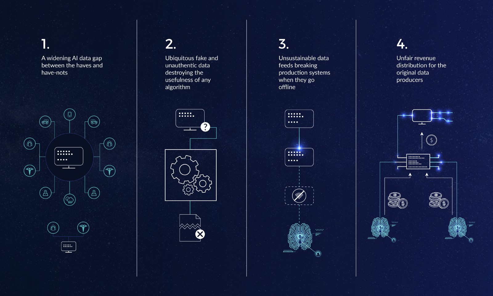In some cases, the data exists in small fragments contained by entities that do not know what to do with them. The reality, however, is that there is an awful lot of data out there. Thoughtful devices, sensors, people, businesses and other technologies, generating huge amounts of data every second. However, unless someone has the resources to use it, the data remains out of reach. What's missing is a solution for organizing and providing this data for everyone. Everyone should be able to achieve the best results of his algorithm and, therefore, produce a better solution for the world. False and Unauthentic Data It is a universal truth that where there is money to be made, people will try to play the system. This is no different in the data economy. Data is easily falsified, copied, and misinterpreted. This makes it difficult for Consumer Data to properly check data when purchasing it from third parties.