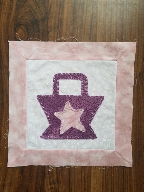 The Mitered Basket block was our next undertaking, for class #4. Using the fusible webbing turned out to be quite enjoyable. The hand embroidery around the basket was a bit of a bother. Those mitered corners were a picky project, but I like the result. Oddly enough, even though this block contained the fewest pieces, it was the hardest one for me to get to turn out square.