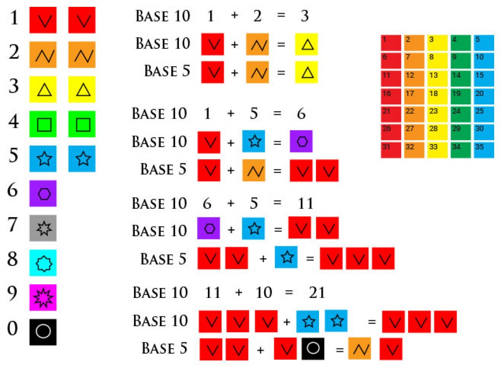 In #ComputerProgramming the code is constantly being converted in base 10, base 2, base 8, base 16. Compare base5 over five iterations and base10 over 5 iterations, like this: