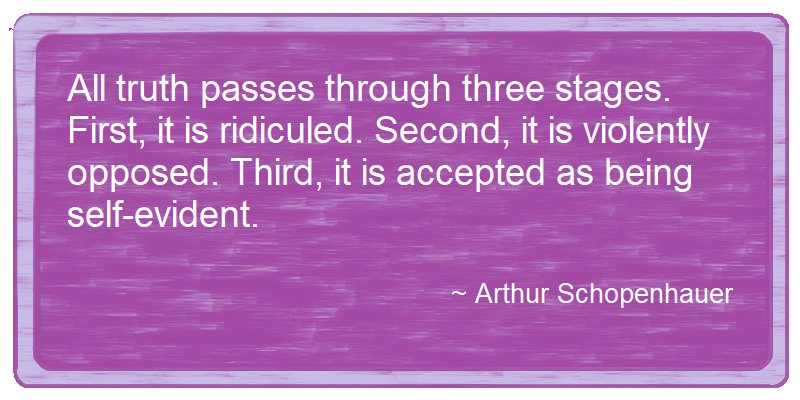 "All truth passes through three stages. First, it is ridiculed. Second, it is violently opposed. Third, it is accepted as being self-evident." - Arthur Schopenhauer