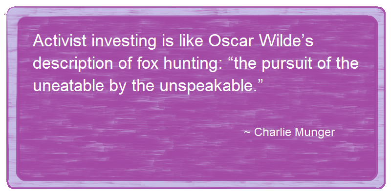 Random Quoterandom-quote (40)in #quote • 7 years ago Activist investing is like Oscar Wilde’s description of fox hunting: “the pursuit of the uneatable by the unspeakable.” - Charlie Munger #philosophy #investing #munger #random-quote