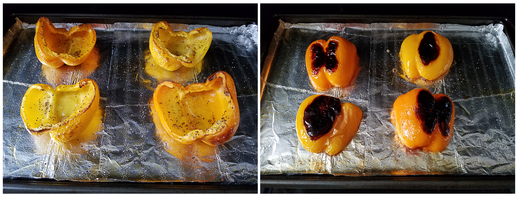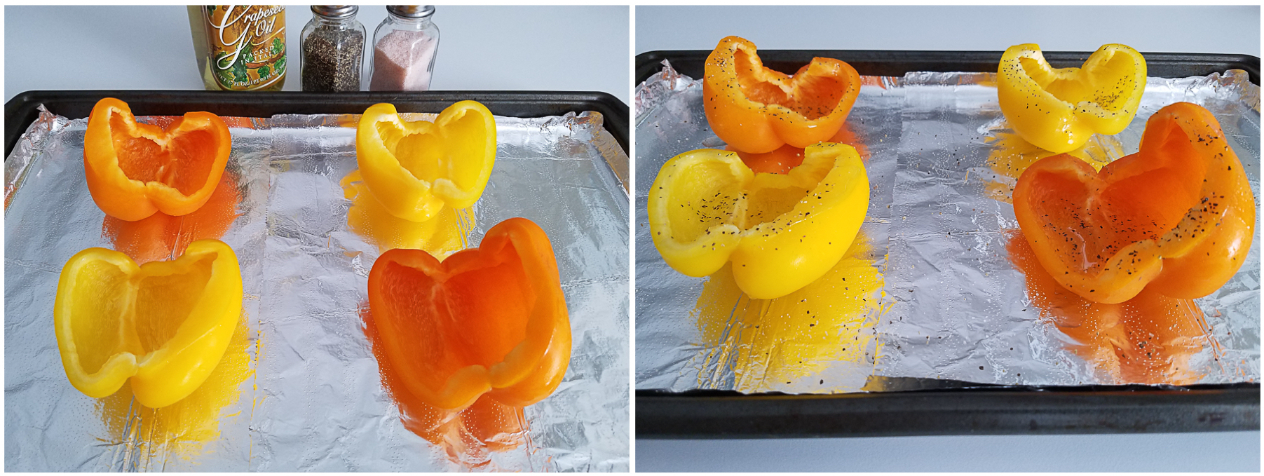 4 - Place pepper halves on a pan lined with aluminum foil and lighly pour the grapeseed oil over them