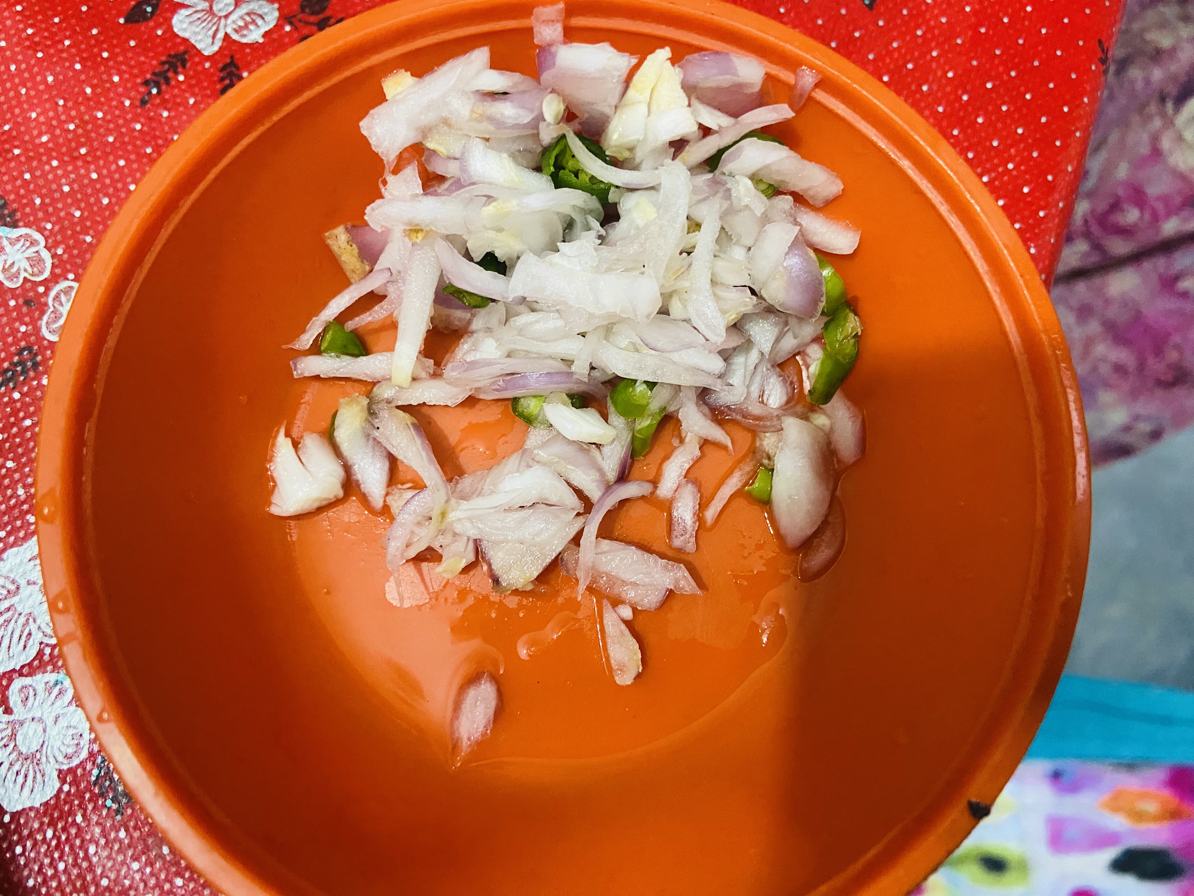 এরপর আমরা পরিমাণ মতো পেয়াজ কুচি এবং মরিচ কুচি নিয়ে নিলাম।