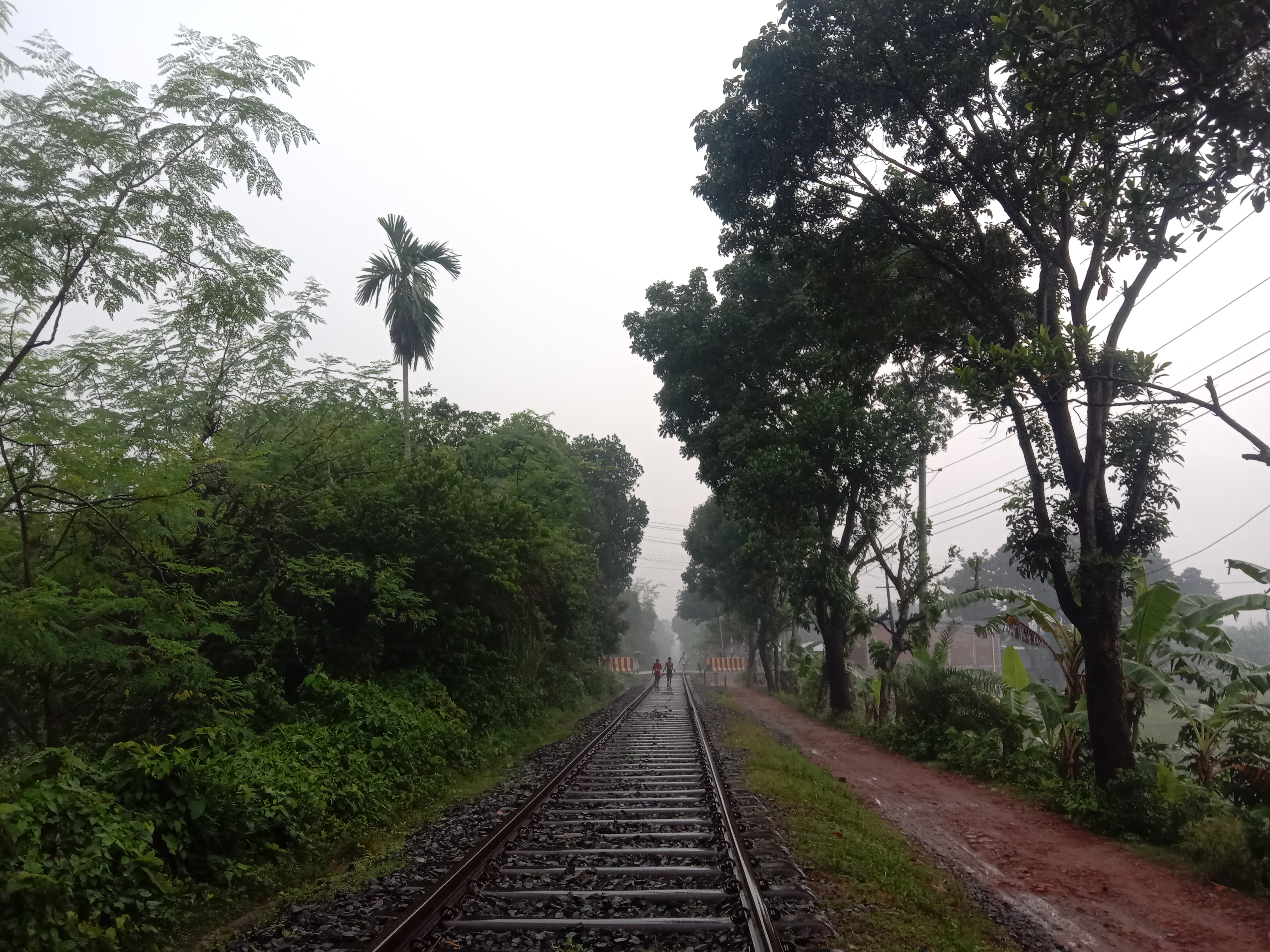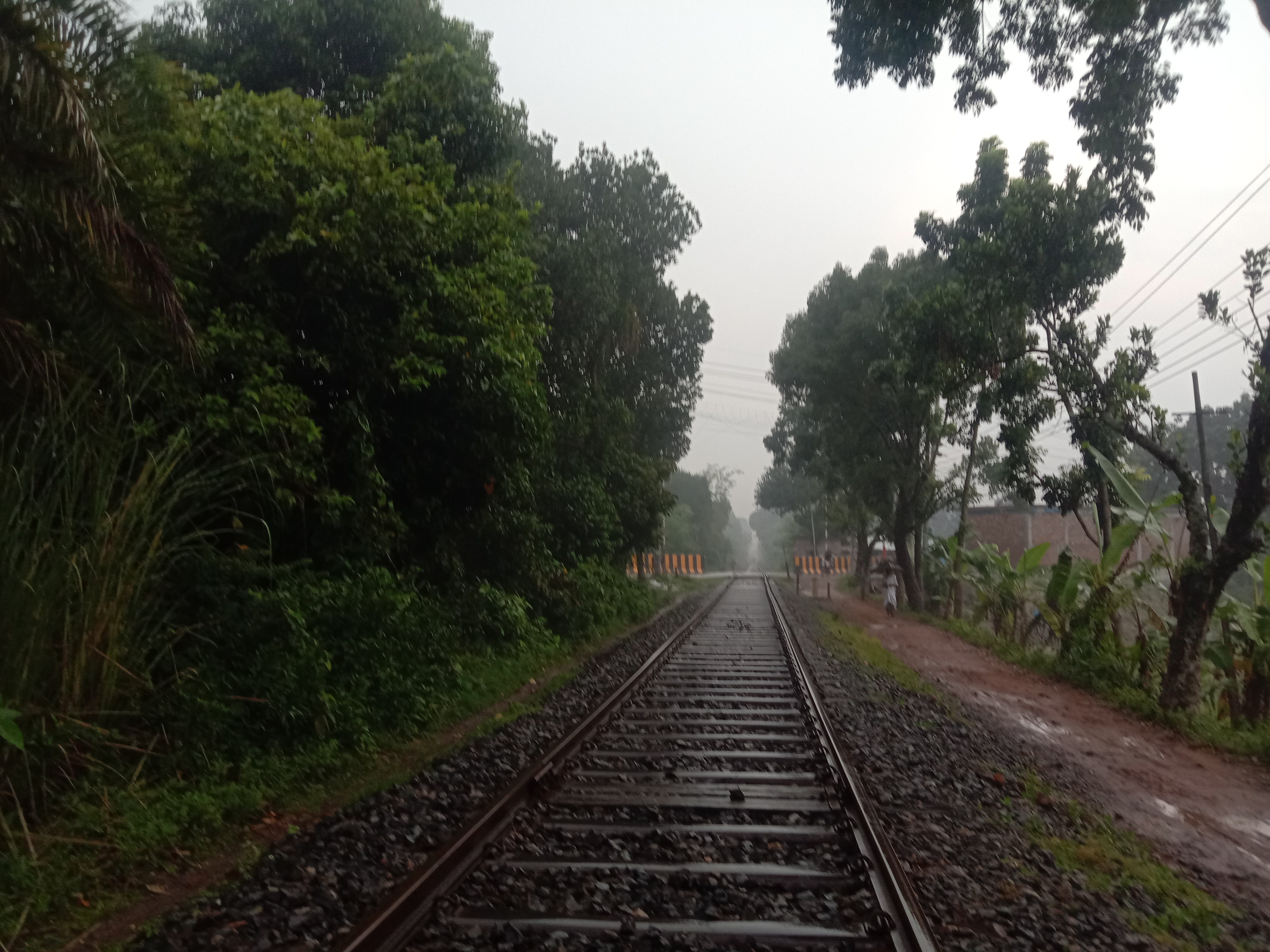 আমাদের এলাকার ঈদগাহ ময়দান টা অনেক কাজে ব্যবহৃত হয়। আমাদের এলাকার পোলাপানের খেলার জন্য সেরকম মাঠ নেই। সেজন্য ওরা এখানেই খেলা করে যদিও এর শুরু হয় অনেক আগে থেকে। তবে বছর ছয় আগে সম্পূর্ণ ঈদগাহ ময়দান টা কংক্রিটের ঢালাই করে দেওয়া হয়। সেজন্য পোলাপানের বৃষ্টিতে ক্রিকেট খেলা সম্ভব হয়েছে। এরপর সামনের দিকে এগিয়ে গেলাম আমার বাড়ি থেকে কিছুটা এগিয়ে গেলেই পড়ে রেললাইন। বৃষ্টির পরে অবশ্য রেললাইন ধরে হাঁটতে বেশ দারুণ লাগে আমার।। ওটা ধরে কিছুদূর হেঁটে গেলাম। আবার ফিরে এলাম। ততক্ষণে বৃষ্টি থেমে গেছে কিন্তু শুরু হয়েছে বাতাস। ছাতাটা বন্ধ করলাম। বৃষ্টির পরে যে বাতাসটা হয় সেটা কিন্তু একটি শীতল হয় শরীরে শিহরণ সৃষ্টি করে। বেশ দারুণ লাগল মূহুর্ত টা। এই মূহুর্ত একেবারেই ধরে রাখার মতো।।।