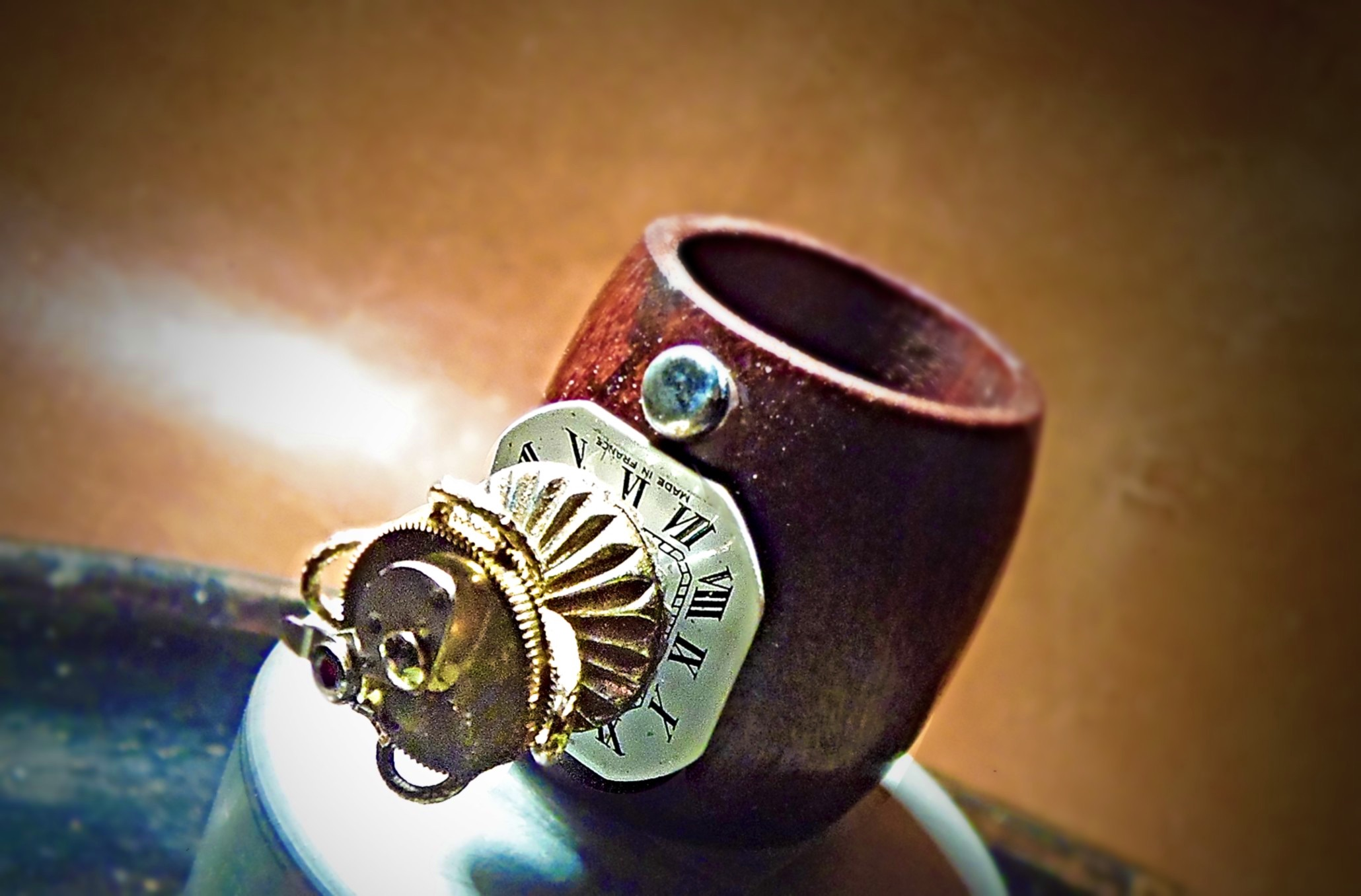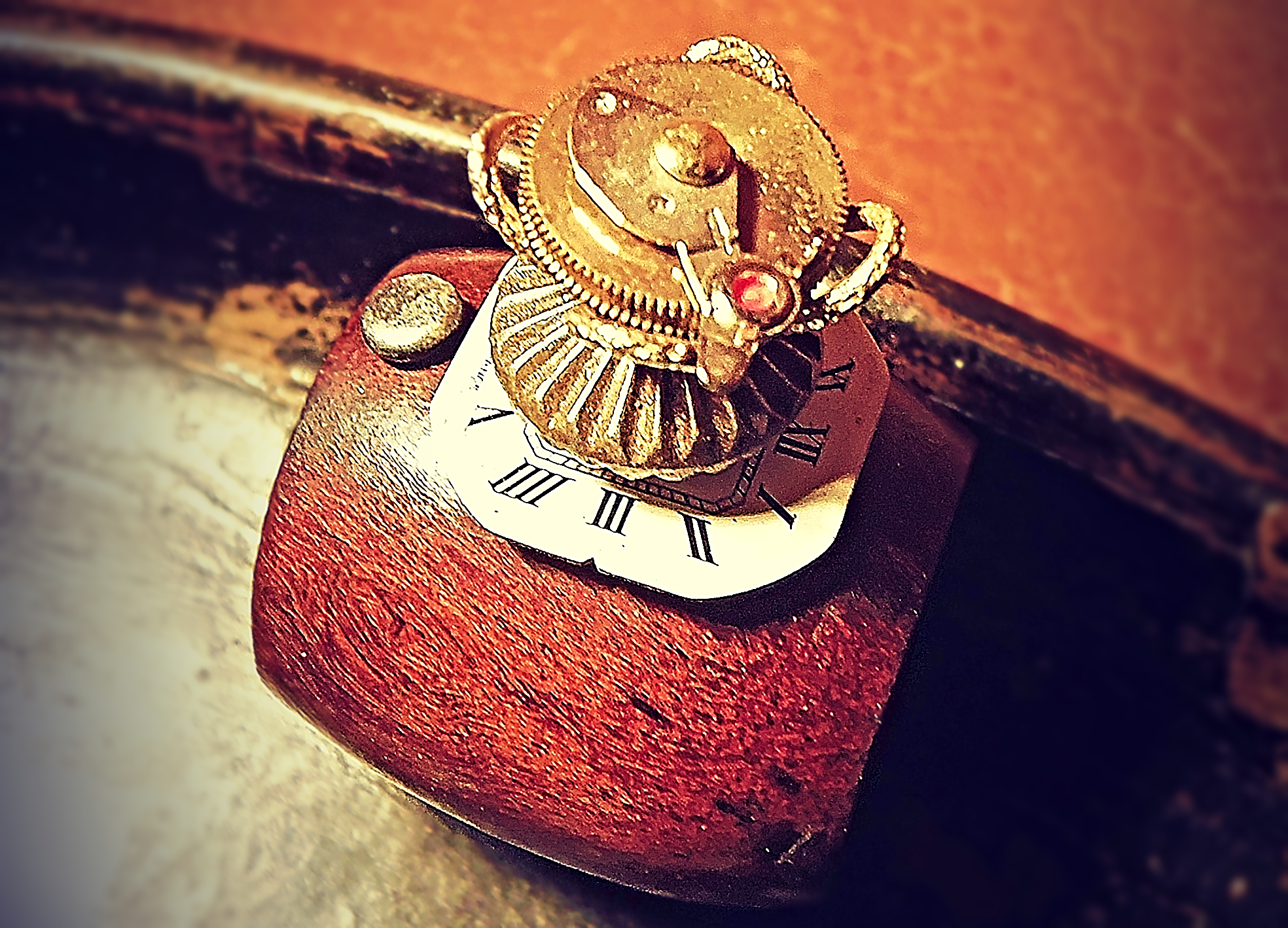 Ring made of antique, broken watch parts and findings.