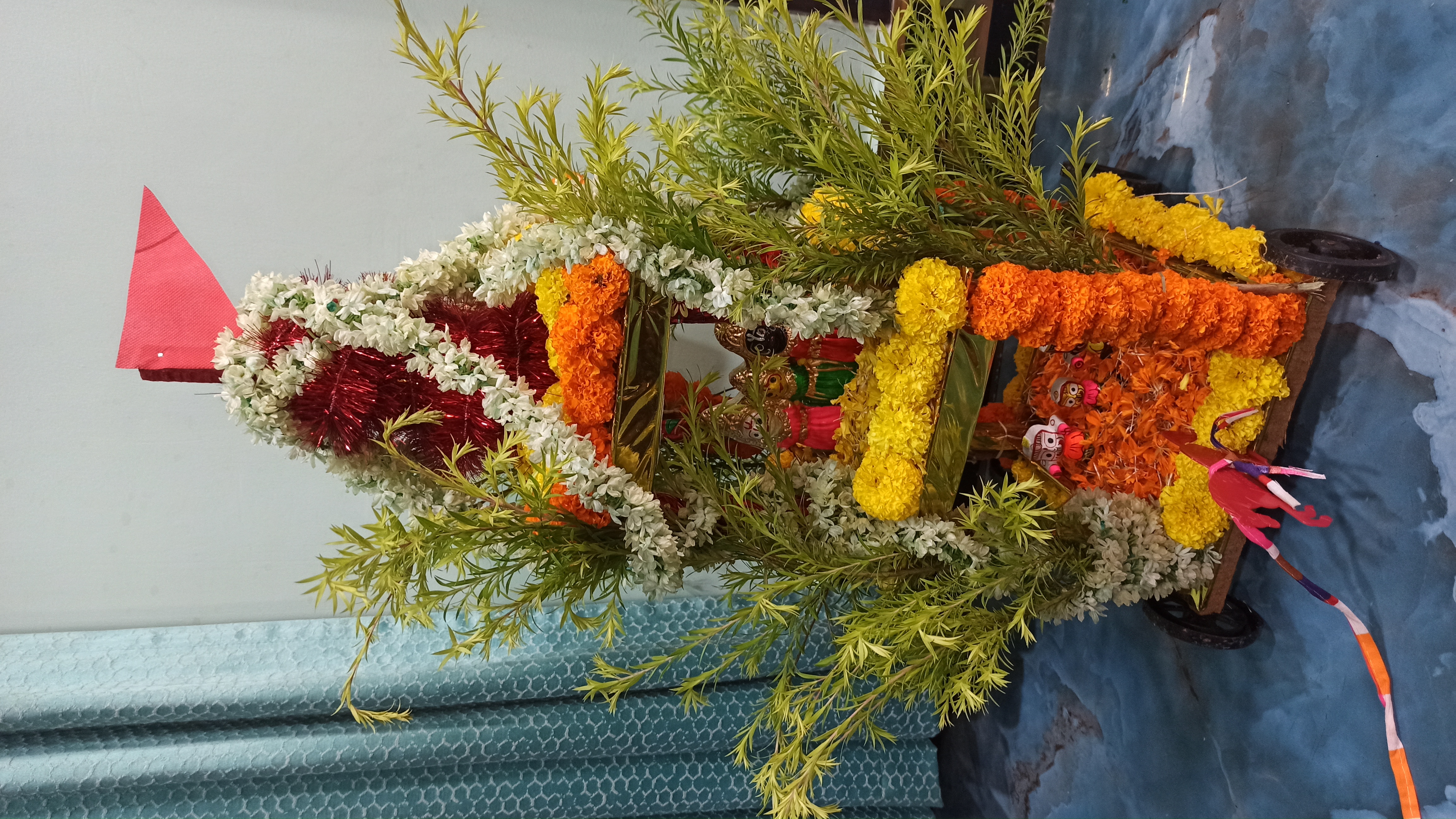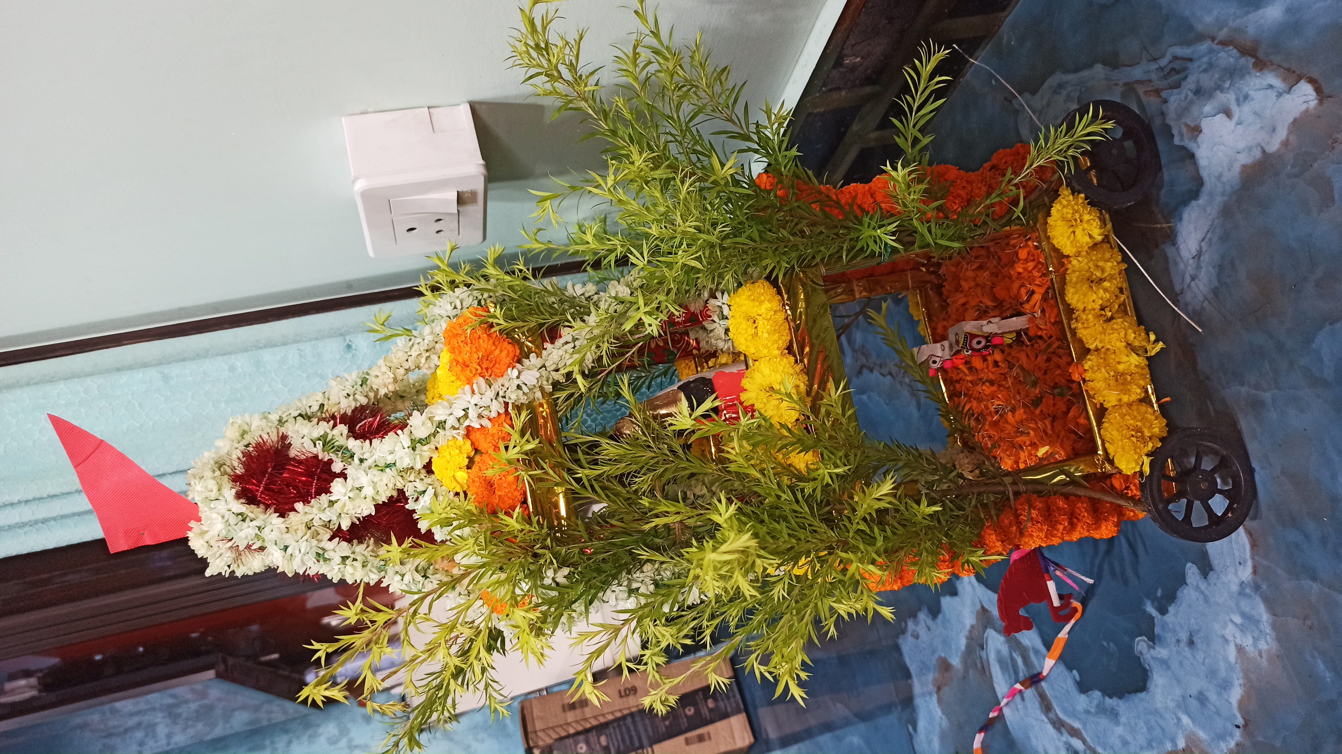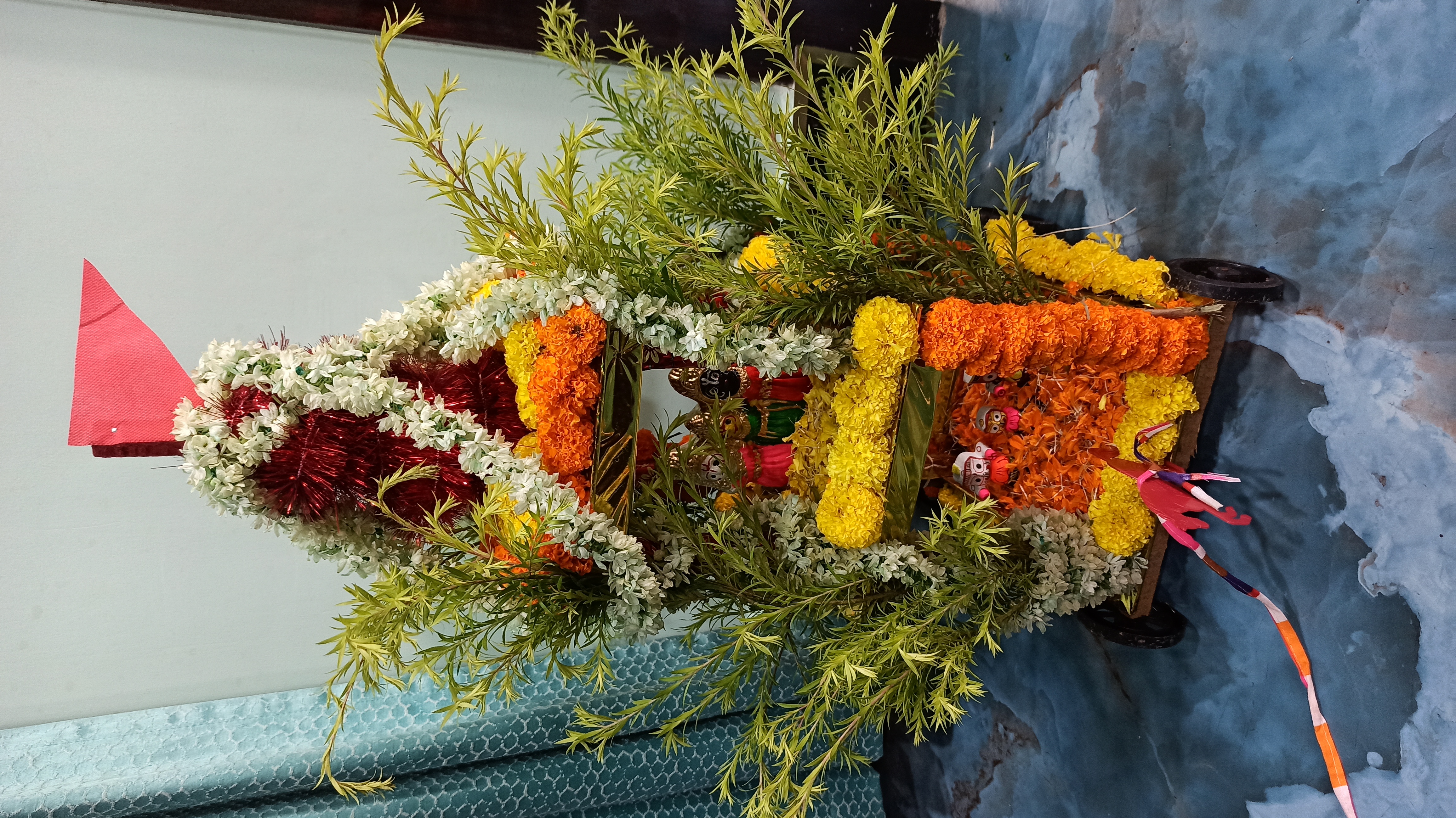 এবার রথের ভিতরে কিছু গাঁদা ফুল বিছিয়ে দিলাম। এবং বিছানো ফুলের উপড়ে জগন্নাথদেবের মূর্তি বসিয়ে দিলাম। তারপর। রথের চারপাশ গাঁদা ফুল দিয়ে সাজিয়ে দিলাম। এভাবেই ফুল দিয়ে পুরো রথটি সাজিয়ে তুলেছি।