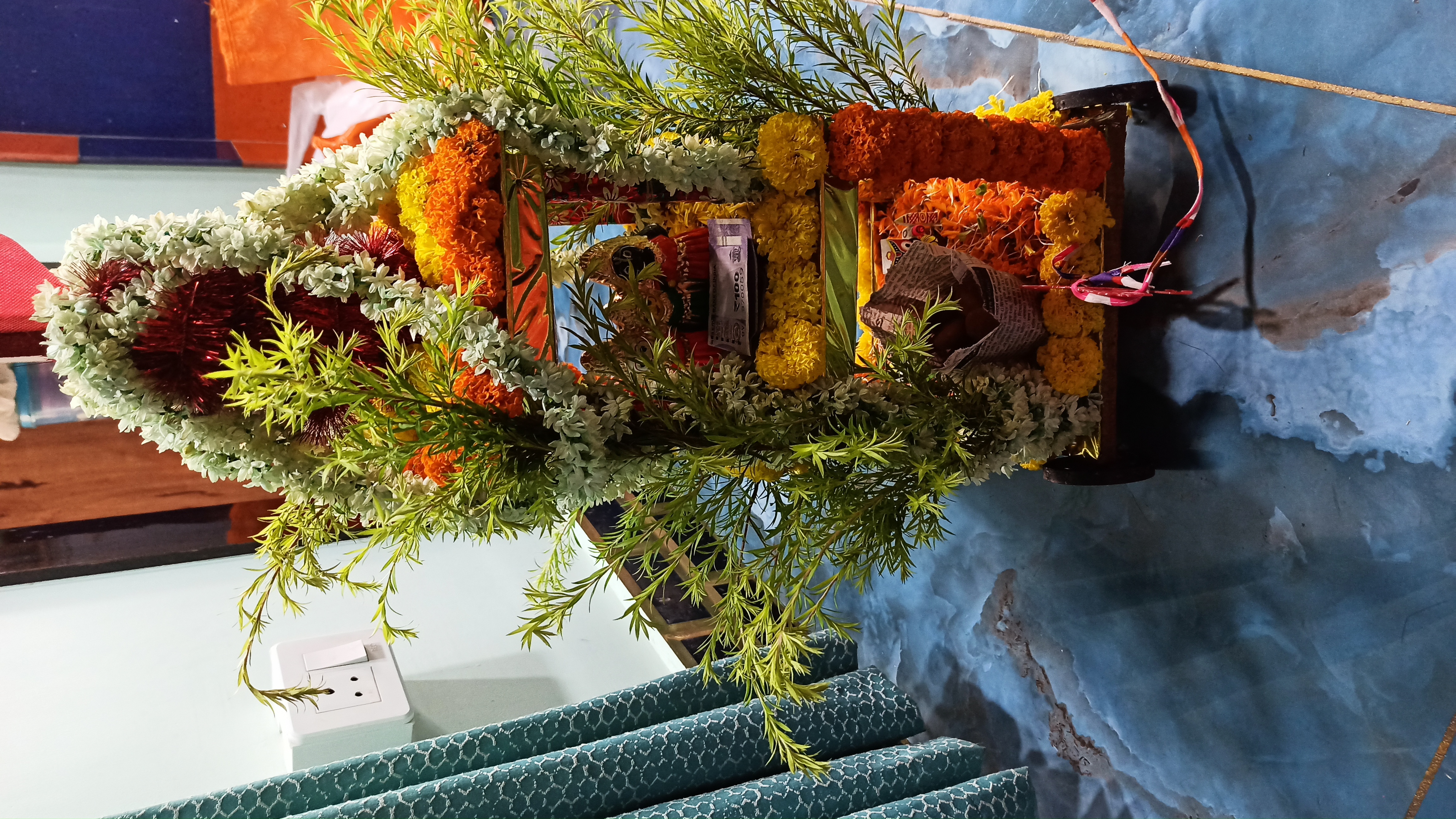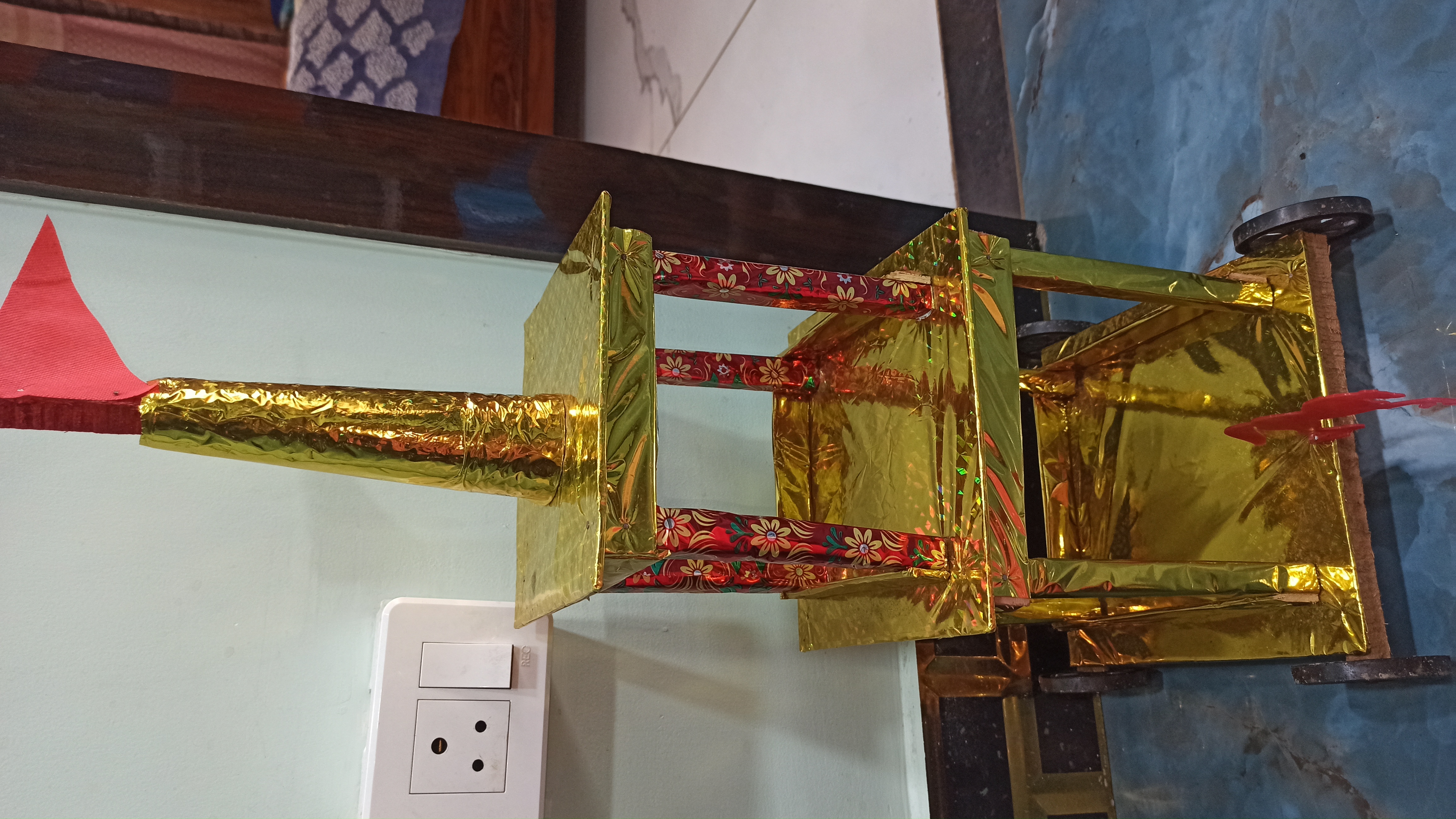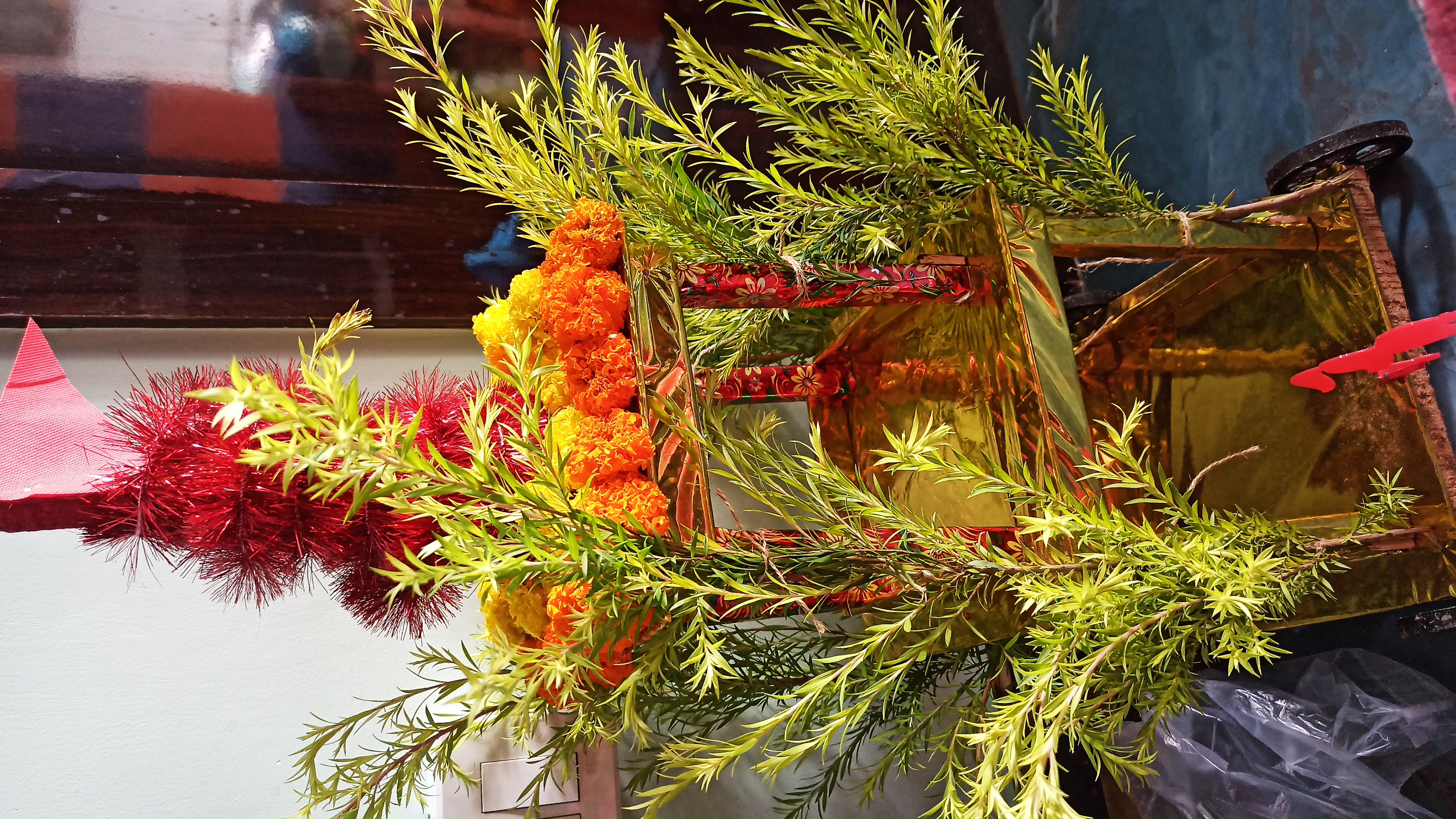এবার রথের ভিতরে কিছু গাঁদা ফুল বিছিয়ে দিলাম। এবং বিছানো ফুলের উপড়ে জগন্নাথদেবের মূর্তি বসিয়ে দিলাম। তারপর। রথের চারপাশ গাঁদা ফুল দিয়ে সাজিয়ে দিলাম। এভাবেই ফুল দিয়ে পুরো রথটি সাজিয়ে তুলেছি।