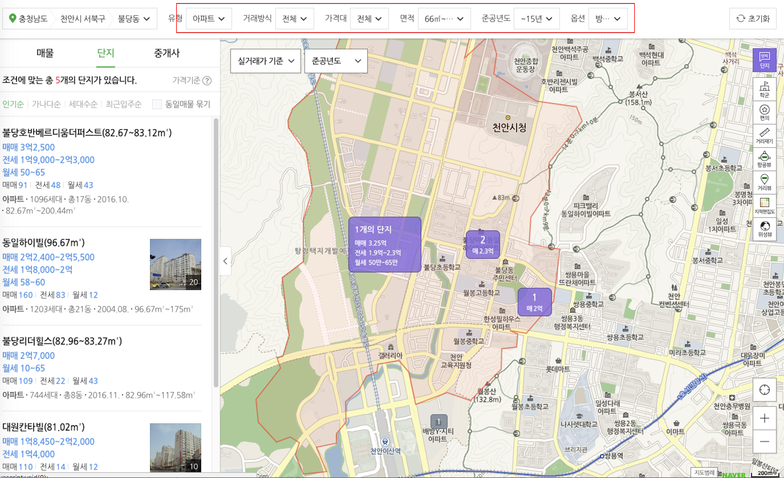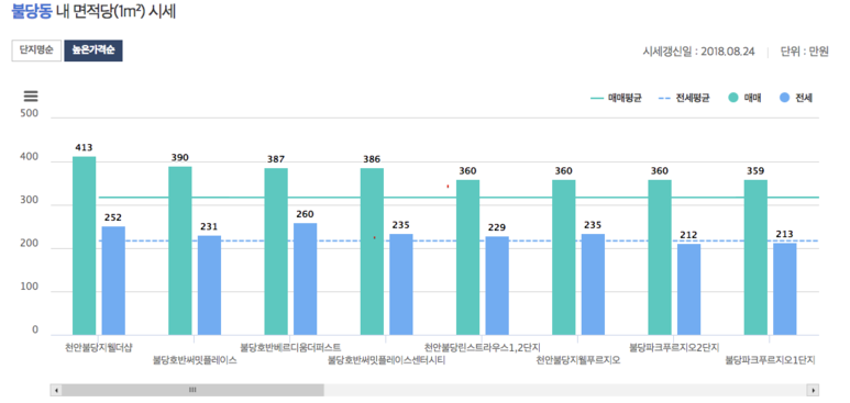 -'시세' 메뉴에서 '불당동'를 클릭하면 불당동의 아파트 시세가 나옴, '높은 가격순' 정렬하여 평균이상인 지역 찾기