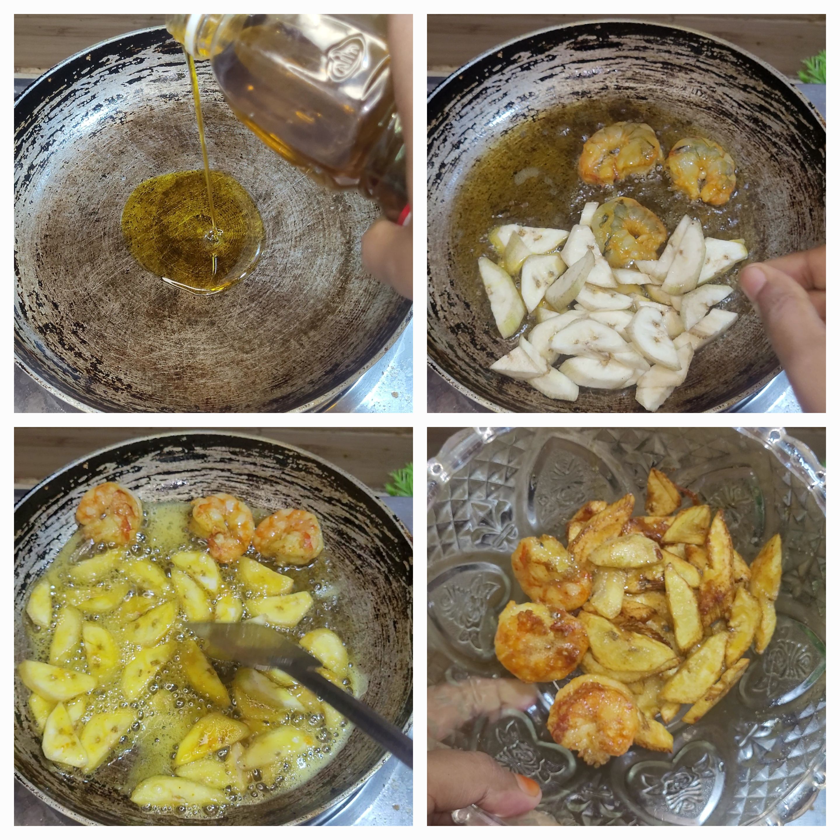 এখন ফ্রাই প্যানে সরিষার তেল দিয়ে দিলাম। তেল গরম হয়ে এলে এর মধ্যে চিংড়ি মাছ এবং কলা দিয়ে ভালোভাবে ভেজে তুলে নিলাম।