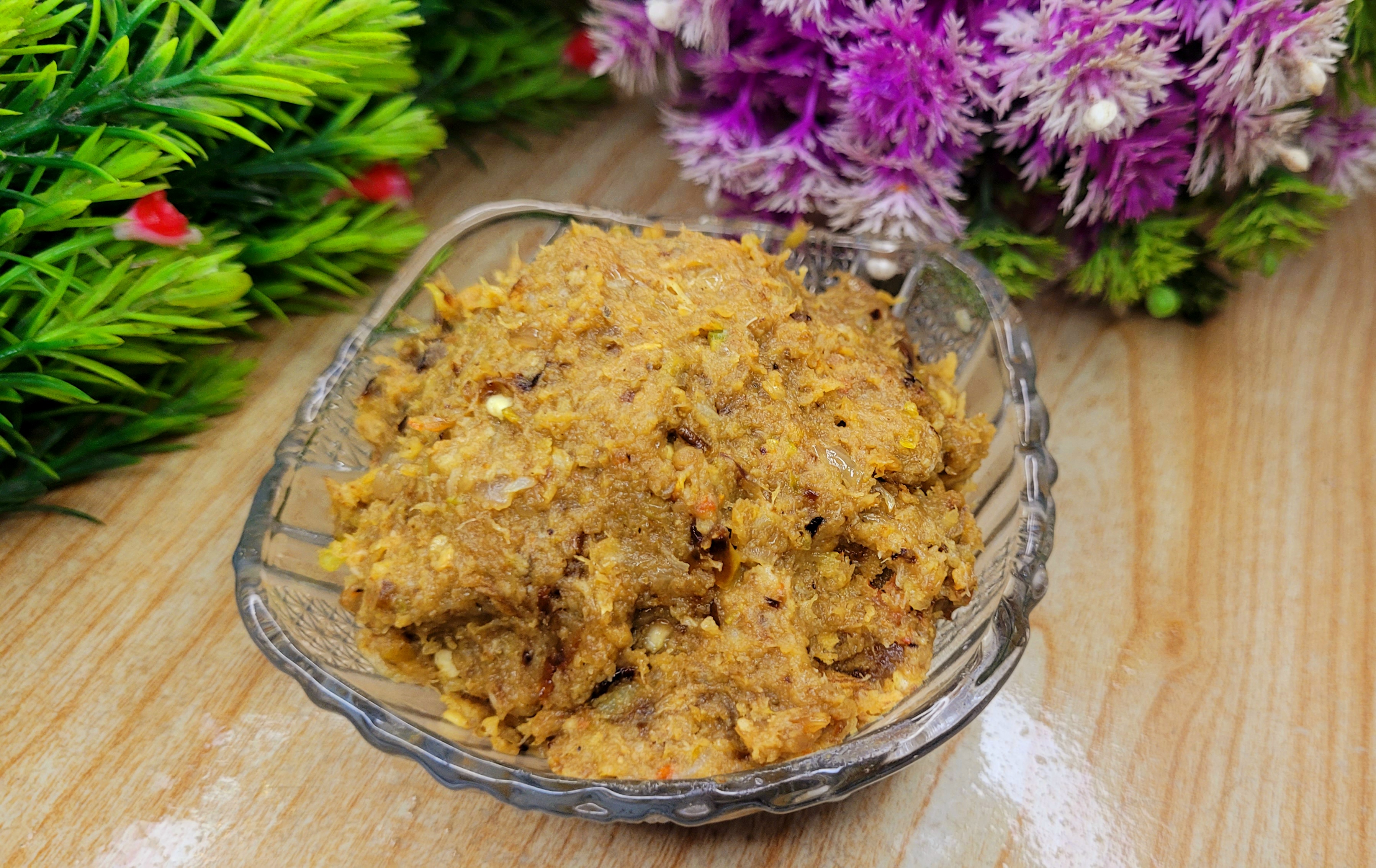 চিংড়ি দিয়ে কাঁচকলার ভর্তা।