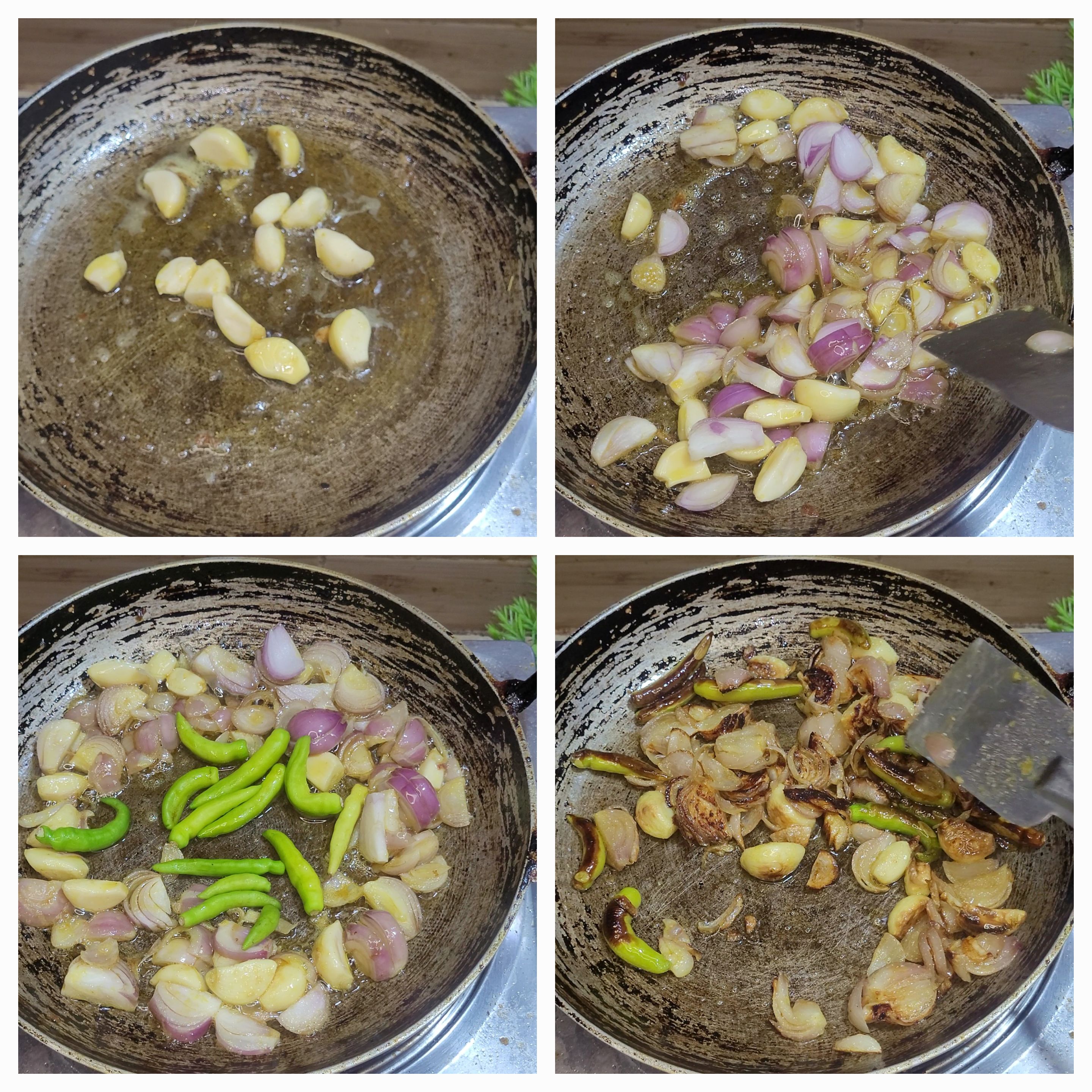 এই ধাপে এক এক করে রসুন, পেঁয়াজ এবং কাঁচামরিচ দিলাম।সবগুলো ভালোভাবে ভেজে নিলাম।
