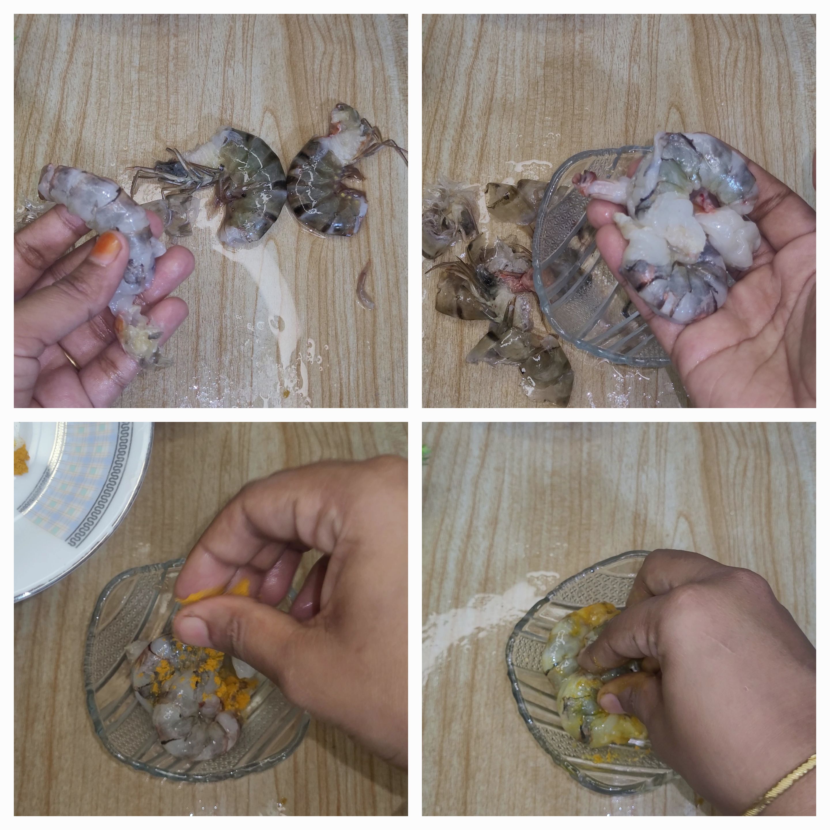 এখন ধুয়ে রাখা চিংড়ি মাছ গুলোর খোসা ছাড়িয়ে নিলাম। তারপর লবণ এবং হলুদ দিয়ে মেখে রেখে দিলাম কিছুক্ষণ।