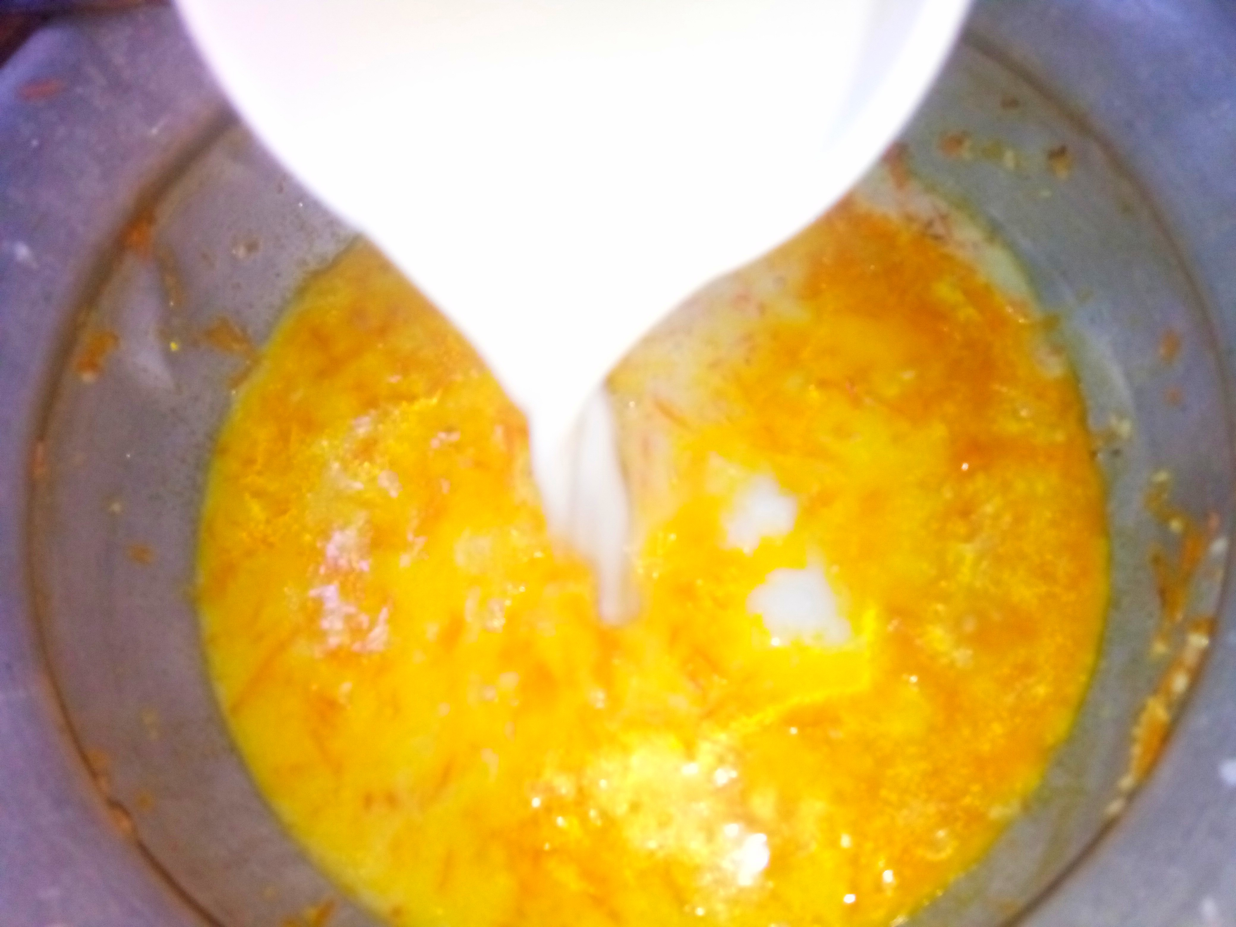 একসাথে ভাজার পরে আমি এর মধ্যে পাঁচ কাপ পরিমাণ দুধ দিয়ে দিলাম এবং নেড়ে মিশিয়ে দিলাম সব কিছু একসাথে।