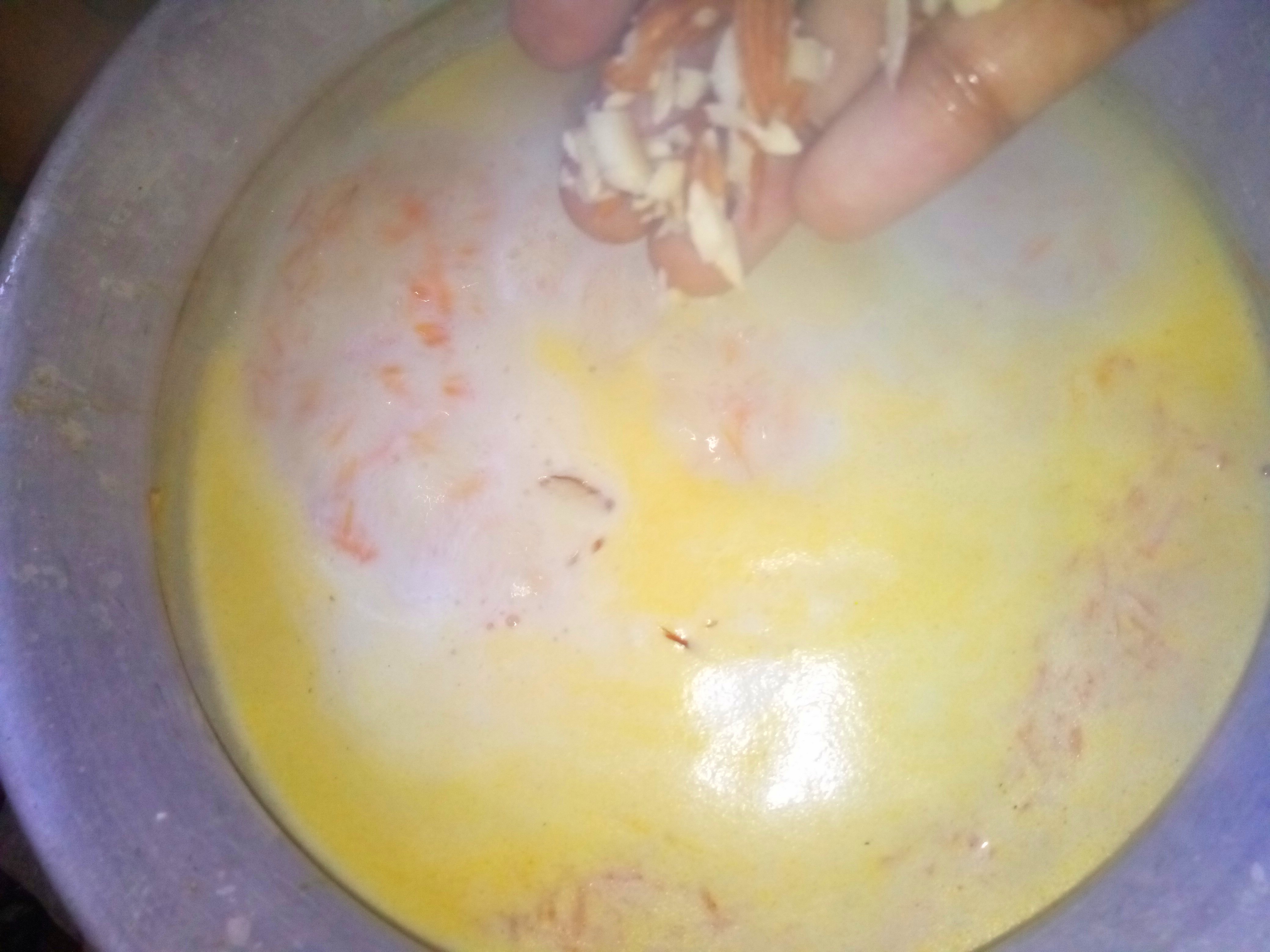 রান্না করতে করতে যখন এগুলো কিছুটা ঘন হয়ে এলো এবং চালগুলো সিদ্ধ হয়ে এলো তখন এর মধ্যে আমি কুচি করে রাখা বাদাম গুলো দিয়ে দিলাম।