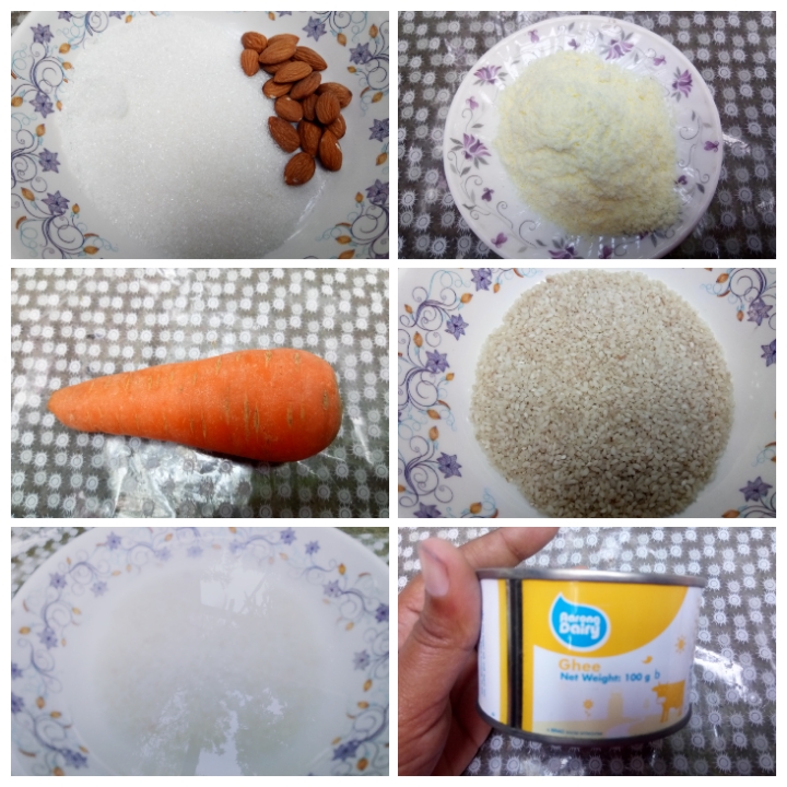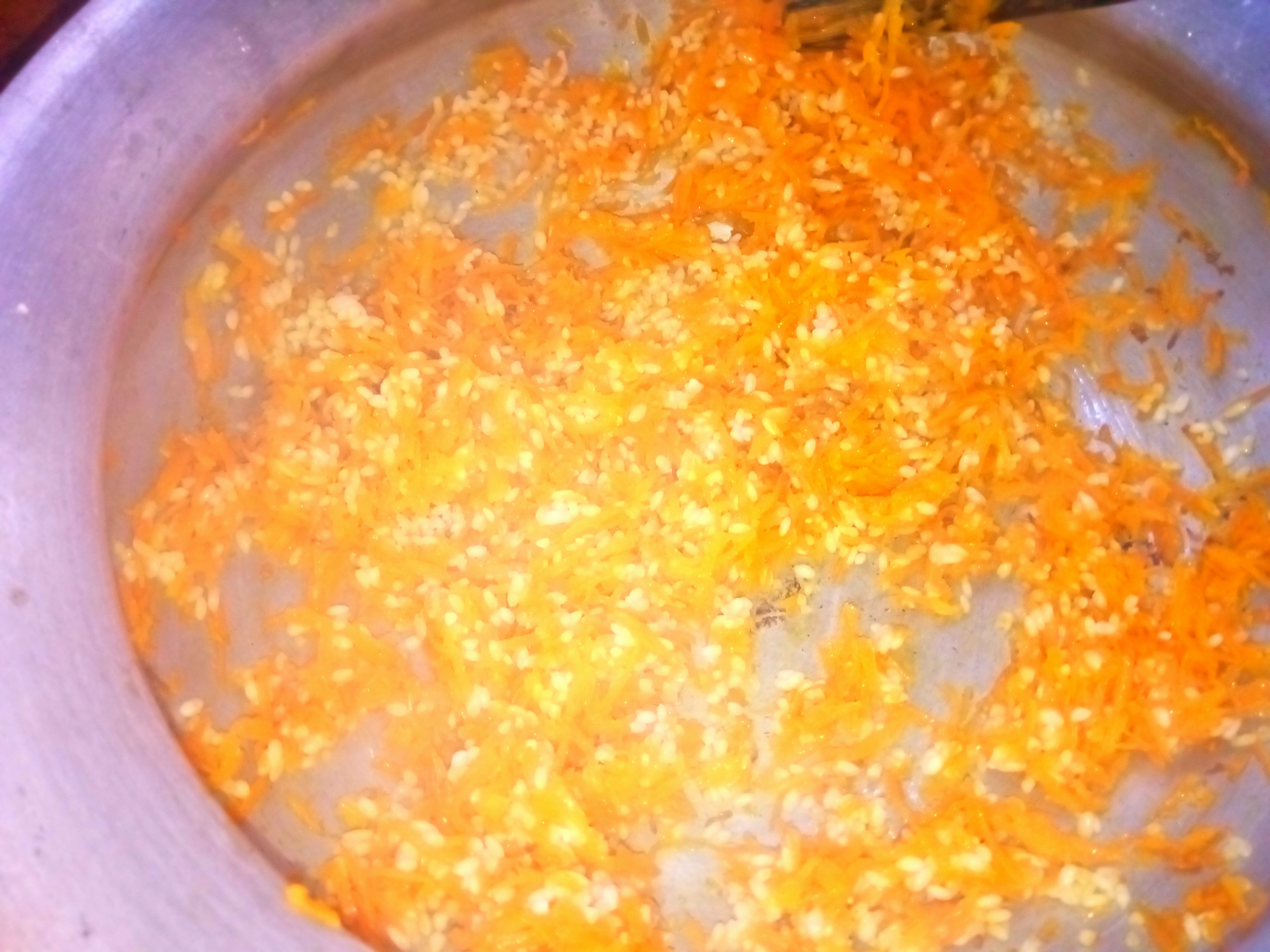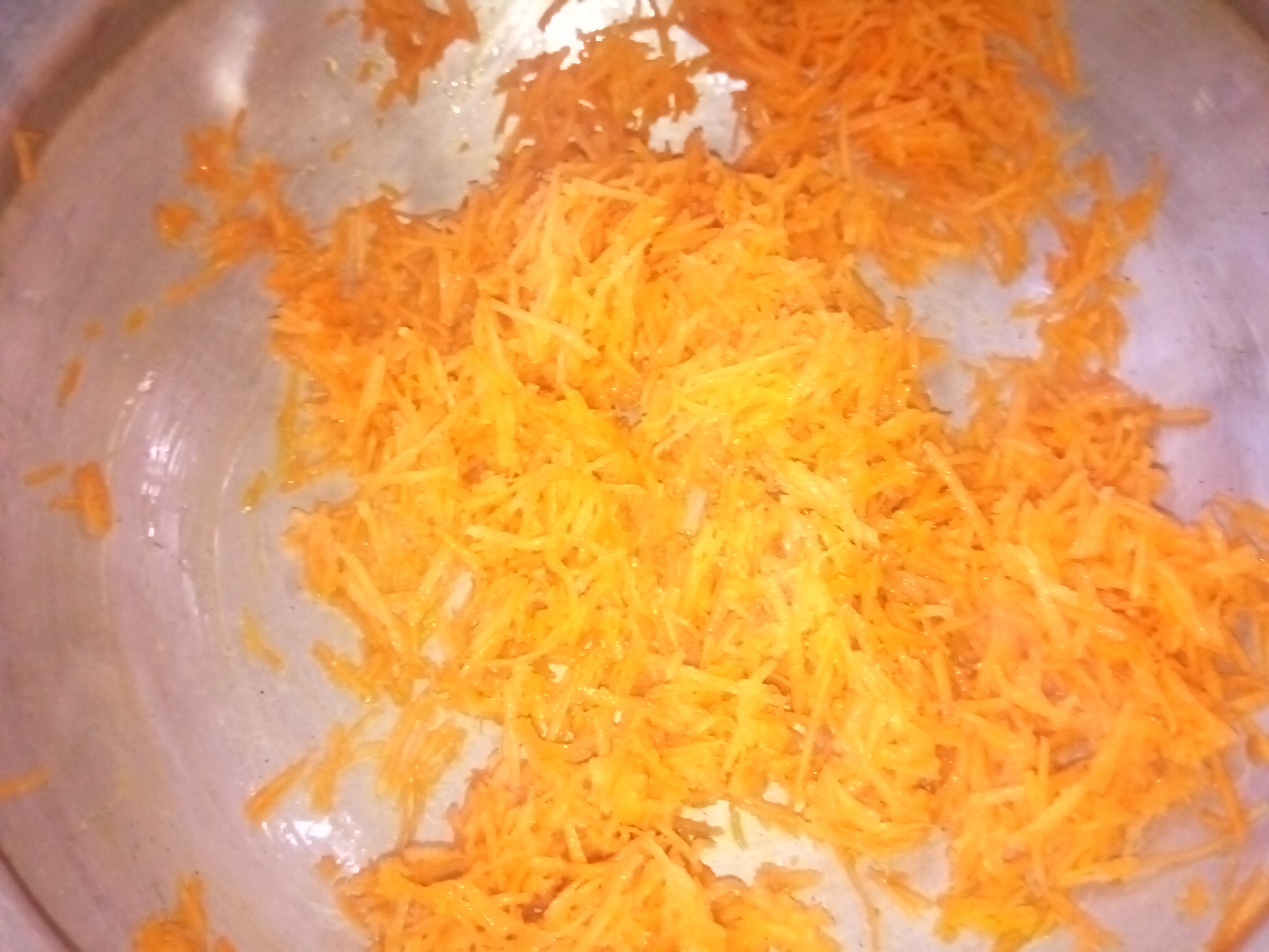ঘি দেয়ার পরে দিয়ে দিলাম গ্রেট করা গাজর। এগুলো দেয়ার পরে আমি ভালোভাবে নেবে কিছুক্ষণ ভেজে নিলাম।