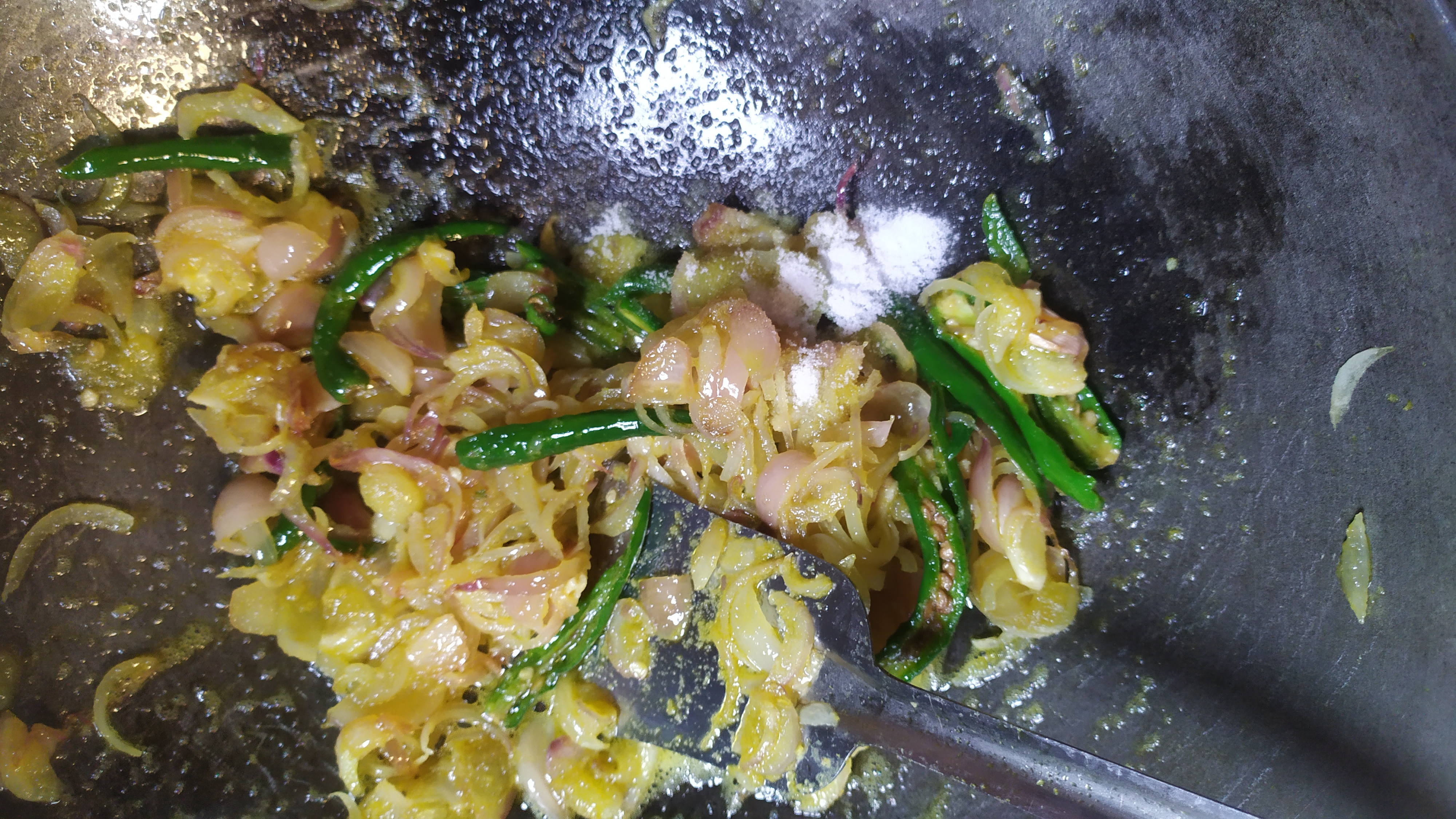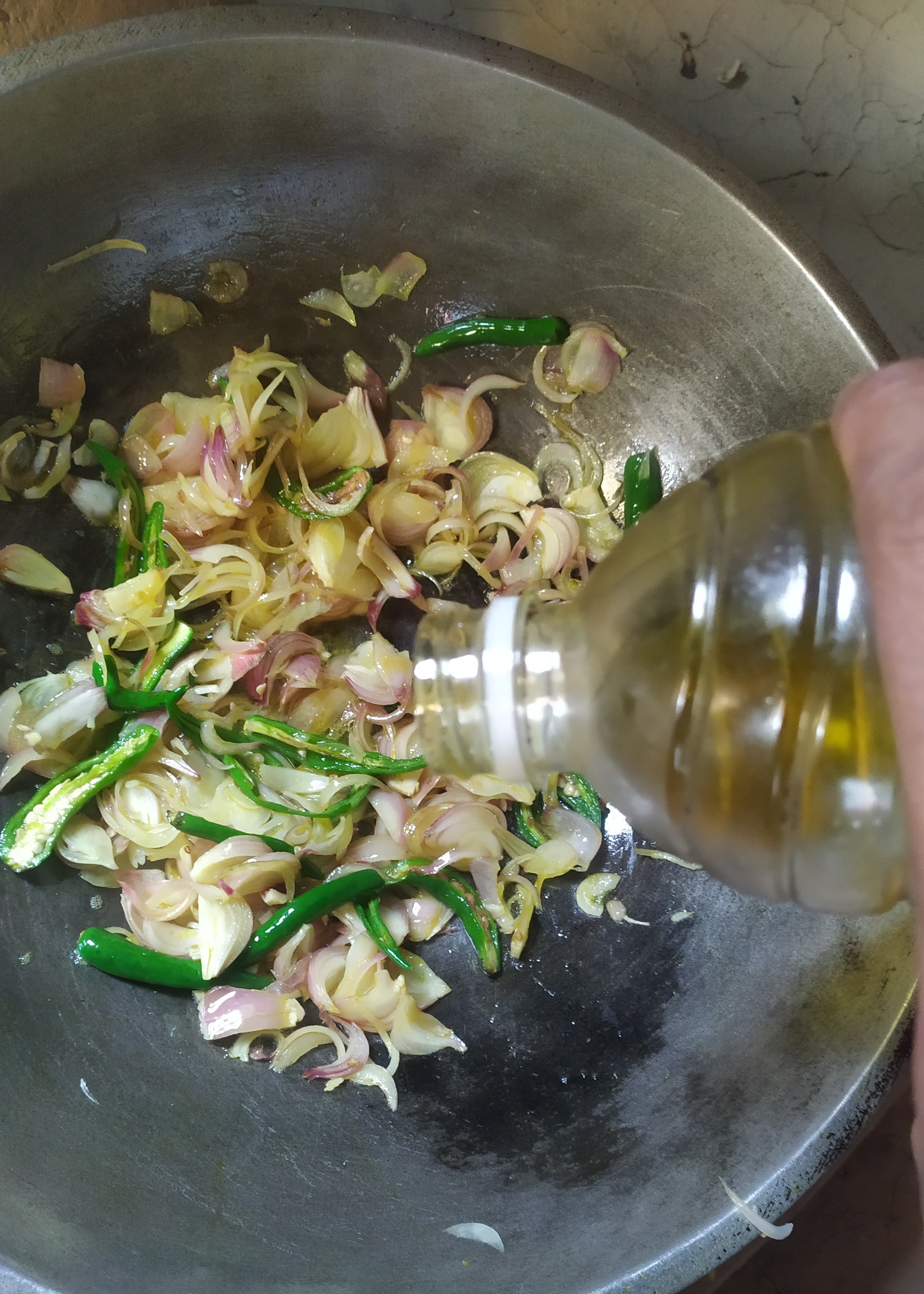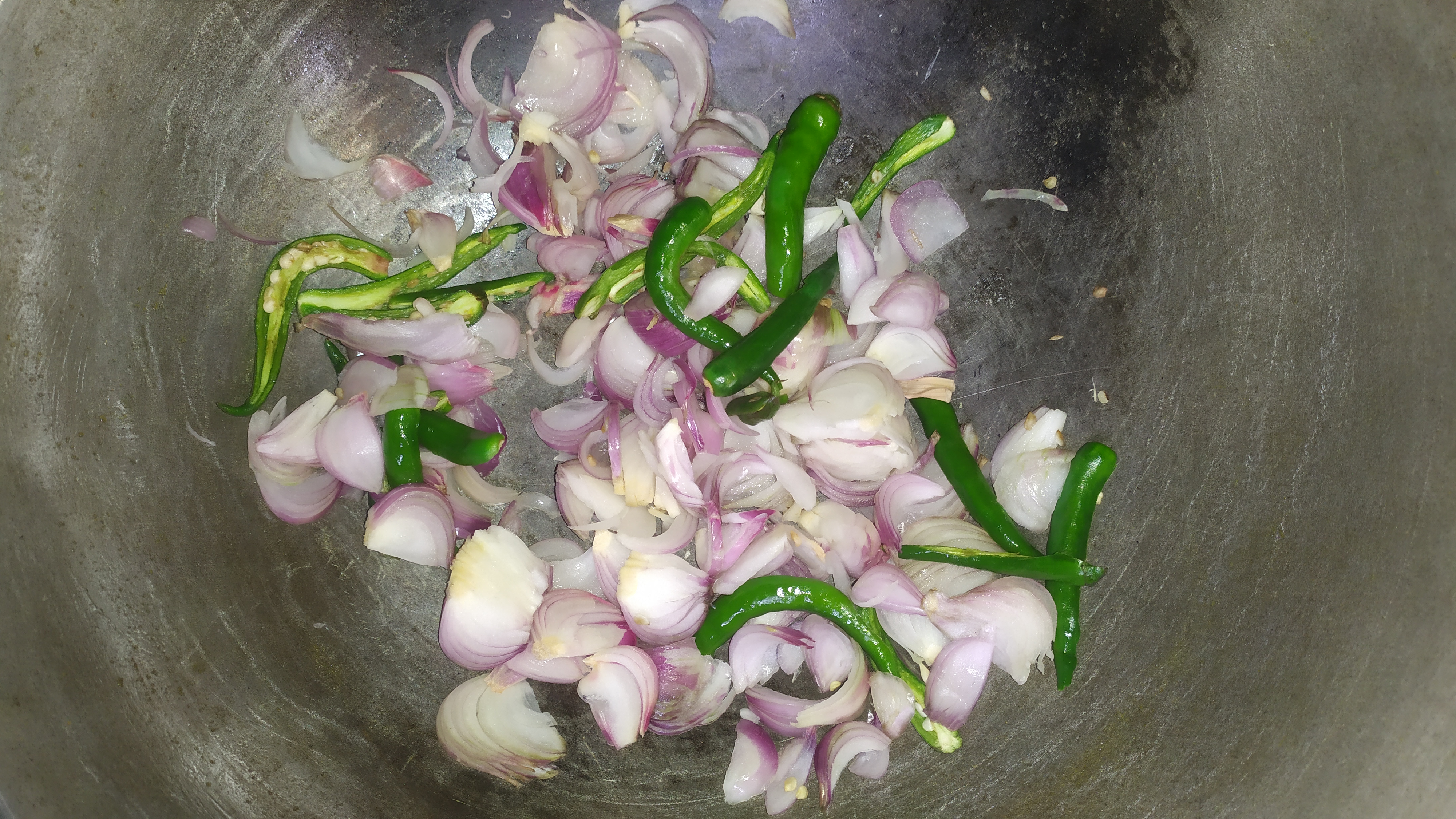 প্রথমে একটা কড়াইতে পিঁয়াজ কুচি এবং মরিচ কুচি দিয়ে নিব।