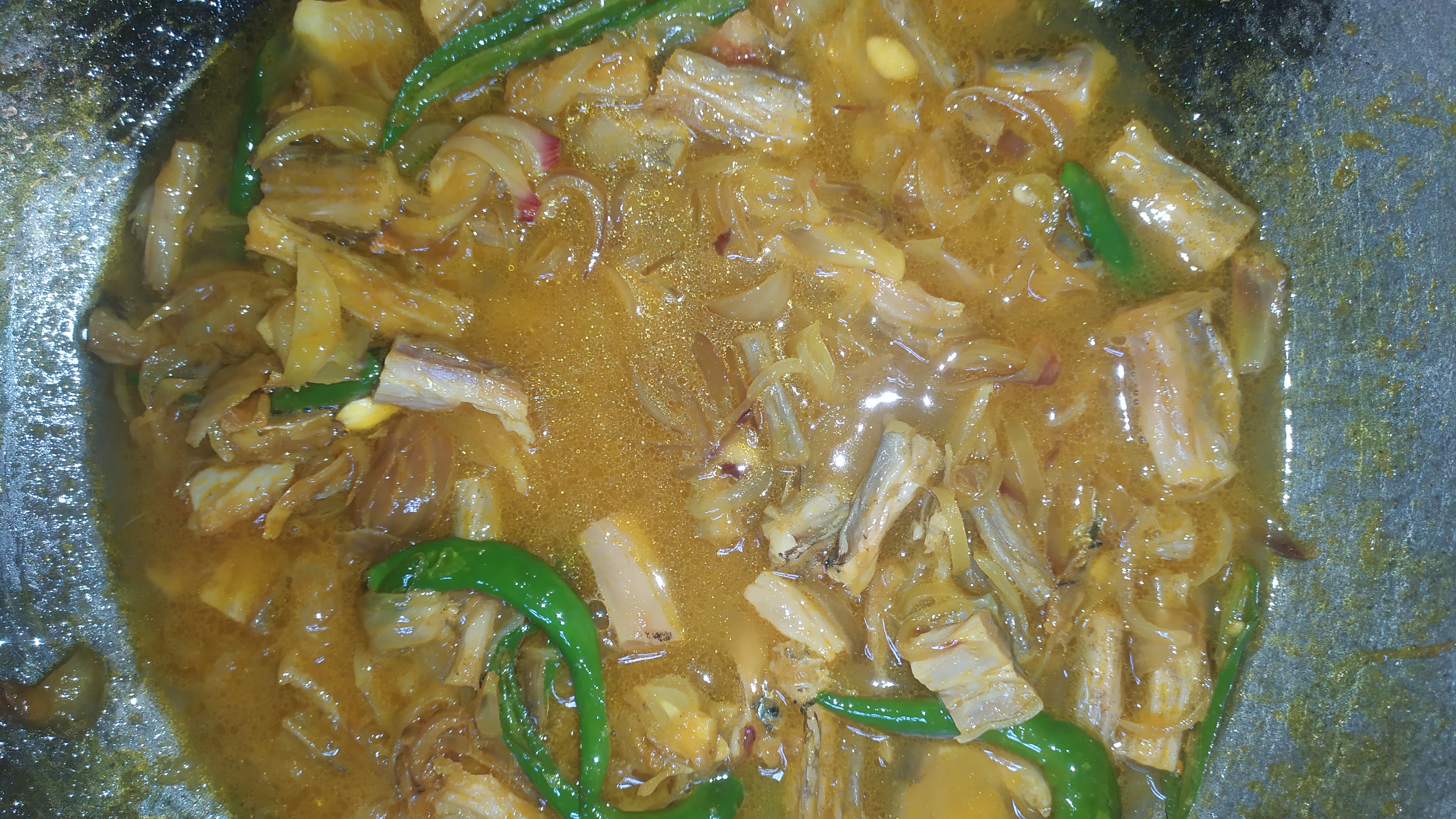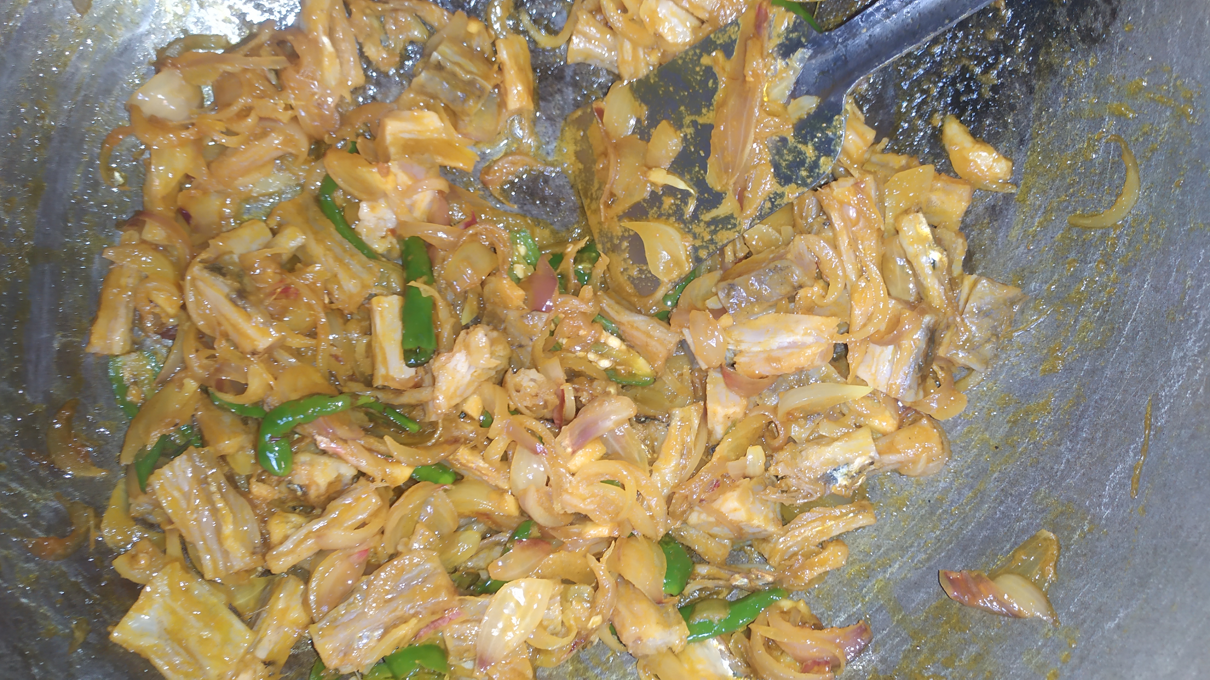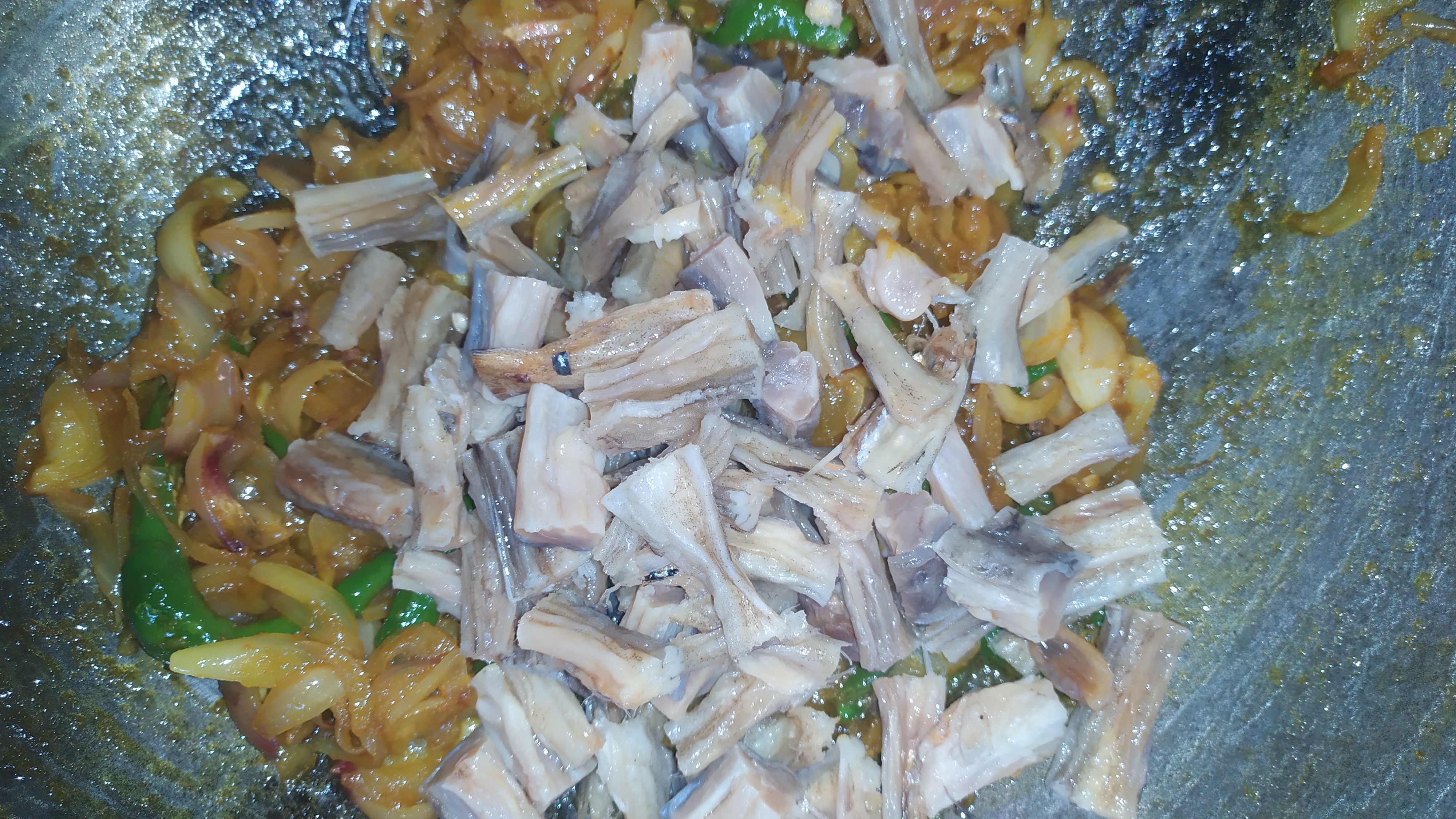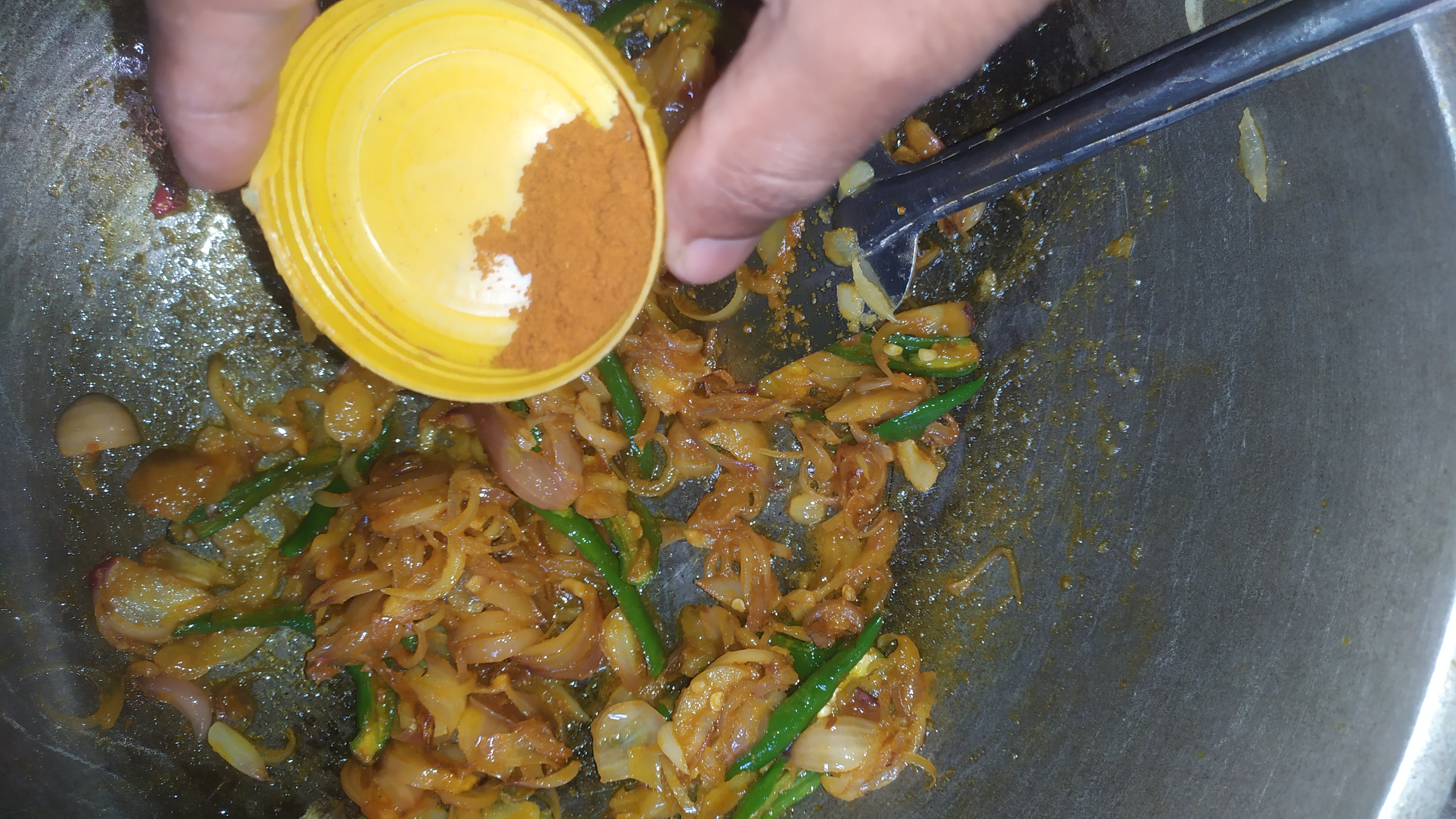 প্রথমে একটা কড়াইতে পিঁয়াজ কুচি এবং মরিচ কুচি দিয়ে নিব।
