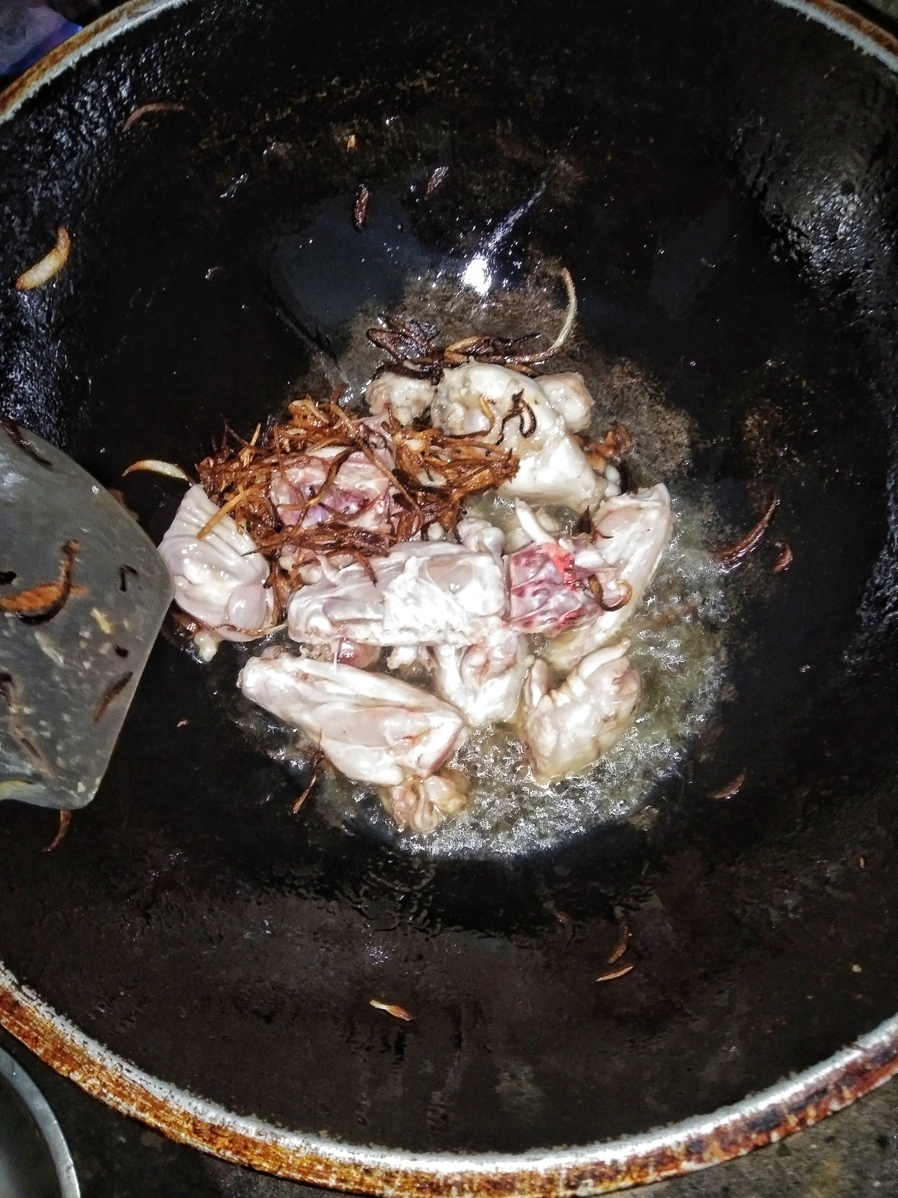 তো এরপর করাইটিতে আরো কিছুটা তেল দিয়ে দিব। এবং এর মধ্যে মাংসগুলোকে দিয়ে দিব। এবং সাথে কিছুটা বাদামী রঙের করে ভাজা পেয়াজ কুঁচি দিয়ে দেবো। এবং এভাবেই কিছুক্ষণ মাংস গুলো কে ভেজে নিব।