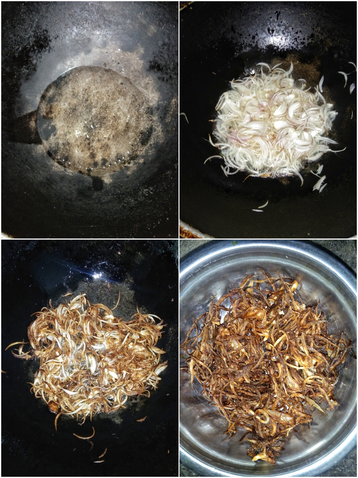 তো এরপর একটা কড়াইতে কিছুটা পরিমাণ তেল দিয়ে এর মধ্যে পেঁয়াজ কুঁচি গুলো দিয়ে যতক্ষণ না পর্যন্ত পেঁয়াজের কালার গুলো চেঞ্জ হচ্ছে ততক্ষণ পর্যন্ত ভাজতে থাকবো। তো যখন পেঁয়াজ কুচি গুলোকে বাদামী রঙেন করে ভাজা হয়ে যাবে তখন এগুকে একটা পাত্রে উঠিয়ে রাখবো।