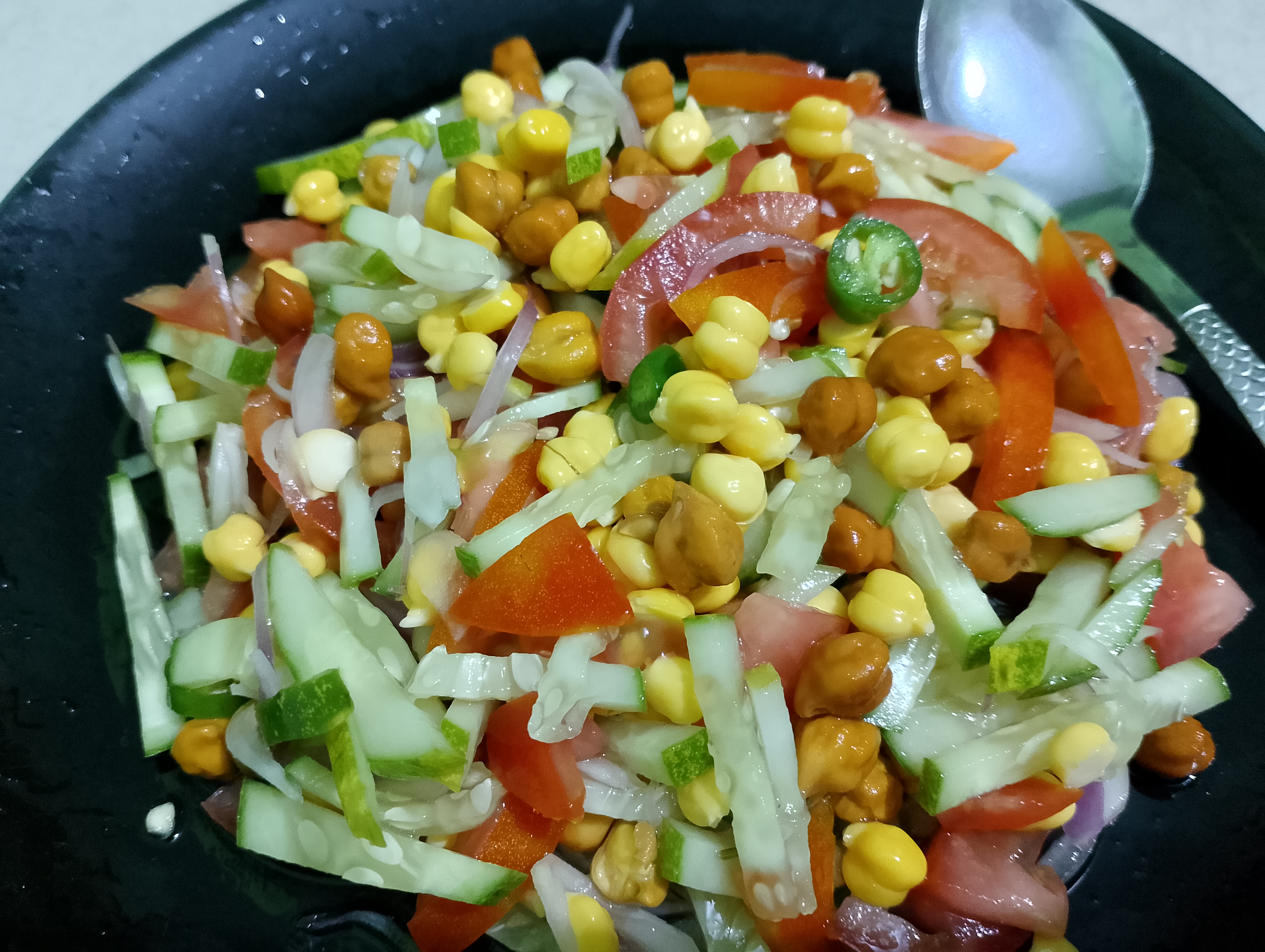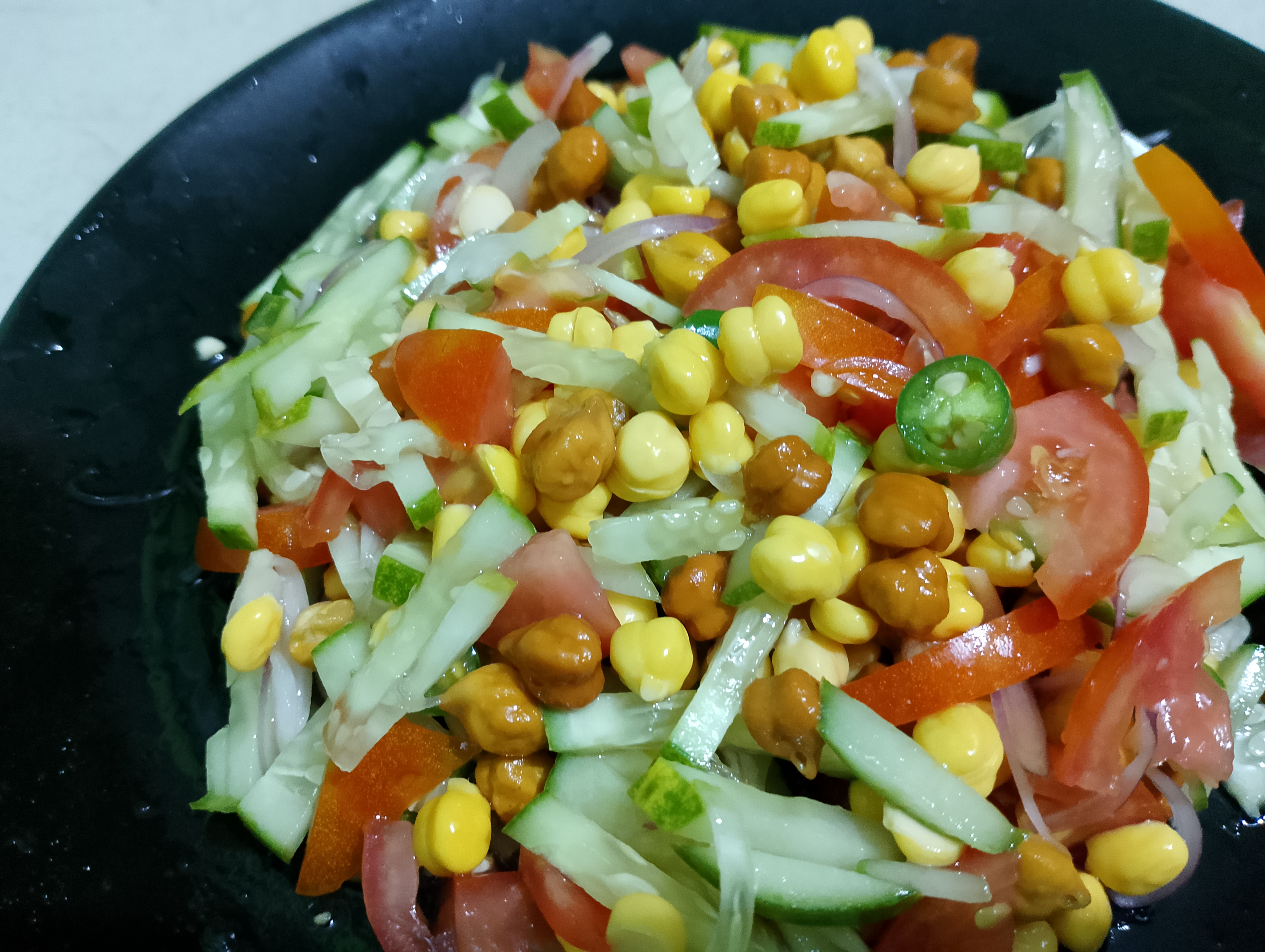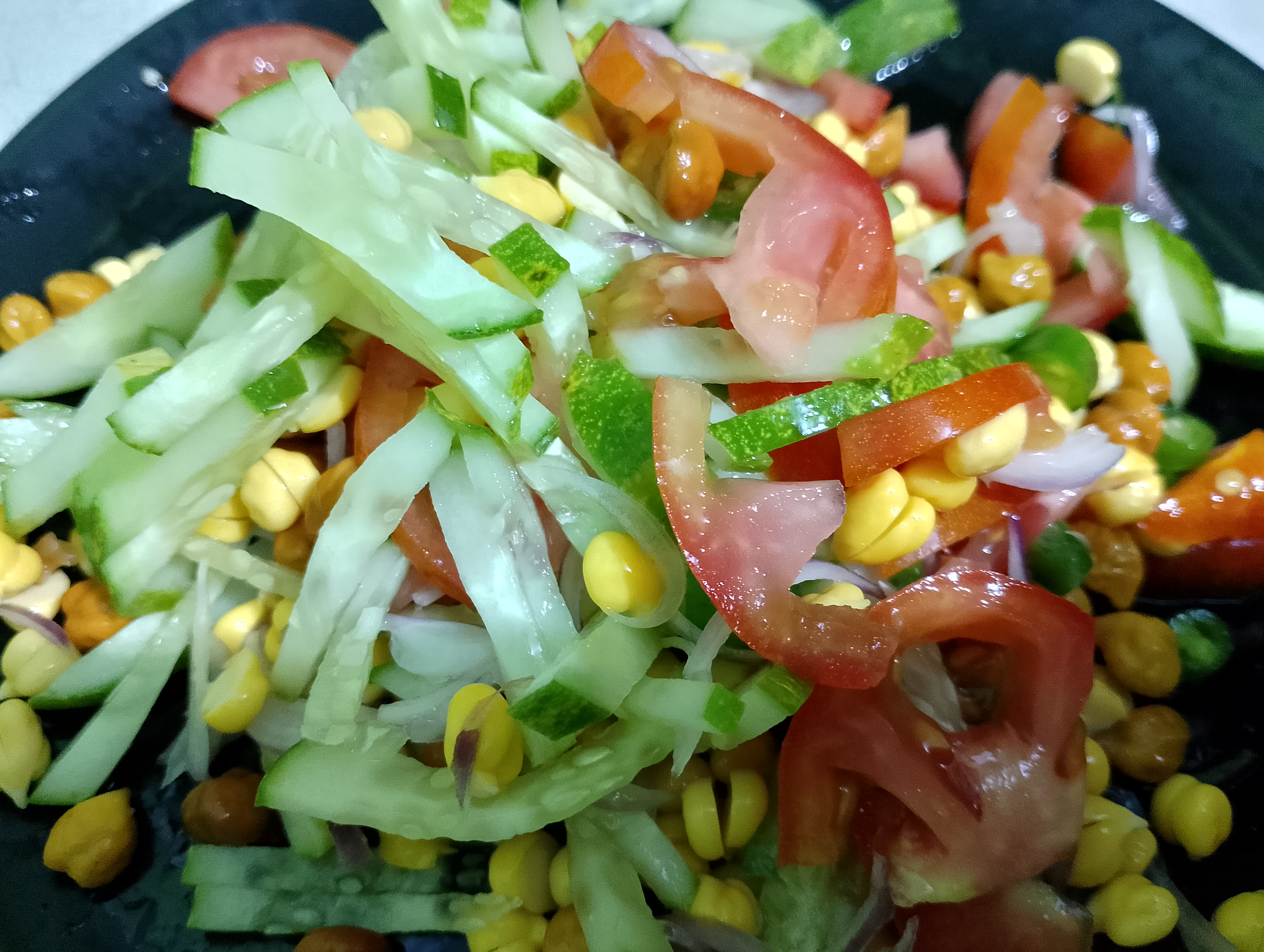 তারপর খিরা, টমেটো কুচি গুলো কাঁচা ছোলার সাথে ভালো ভাবে মাখিয়ে তৈরী করে ফেলাম পুষ্টি গুণে পরিপূর্ণ সুস্বাদু কাঁচা ছোলা মাখা রেসিপি।